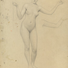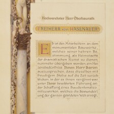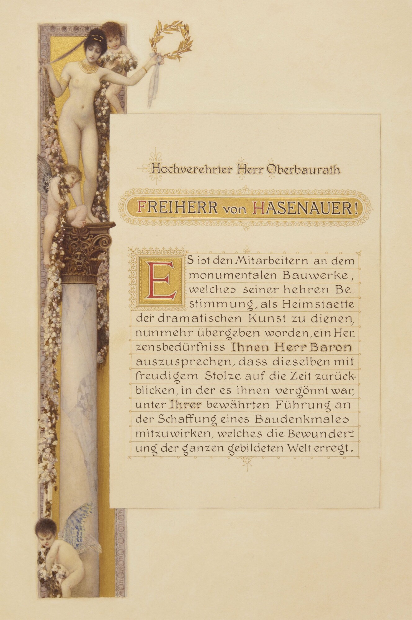 1888/89 war Gustav Klimt sowohl an der Gestaltung einer Huldigungsadresse für den Architekten des Wiener Hofburgtheaters, Carl Hasenauer, als auch an einer Festschrift zum 25jährigen Bestehen des k. k. Museums für Kunst und Industrie beteiligt. In seinen zeichnerischen Beiträgen arbeitete Klimt am zunehmend stilisierten Typus des weiblichen Aktes.