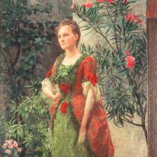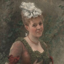 Neben Zeichnungen im Rahmen von Auftragsarbeiten befasste sich Klimt in den 1890ern auch mit der Gattung der Porträtzeichnung. 1891 heiratete Ernst Klimt – Gustavs Bruder – Helene Flöge. In diesem Zusammenhang entstand eine der im Œuvre des Künstlers sehr seltenen Pastellzeichnungen. Das durch Gustav Klimt eigenhändig signierte und auf 1894 datierte Werk (da die Datierung schwer lesbar ist könnte es sich allerdings auch um 1891 handeln) stellt entweder die junge Braut Helene Flöge oder deren damals um die 20 Jahre alte Schwester Emilie Flöge dar (Privatbesitz, S 1980: 247). Mit letzterer verband Klimt Zeit seines Lebens eine besondere Beziehung. Die Darstellung zeichnet sich durch eine überaus präzise Erfassung der Stofflichkeit und des persönlichen Ausdrucks der Porträtierten aus. Durch die Signatur sowie die malerische Gestaltung des Bildrahmens mit Kirschblüten auf goldenem Grund hob Klimt das Werk hierarchisch auf eine Stufe mit seinen Porträts in Öl wie das Porträt Joseph Pembaur (1890, Ferdinandeum, Innsbruck).