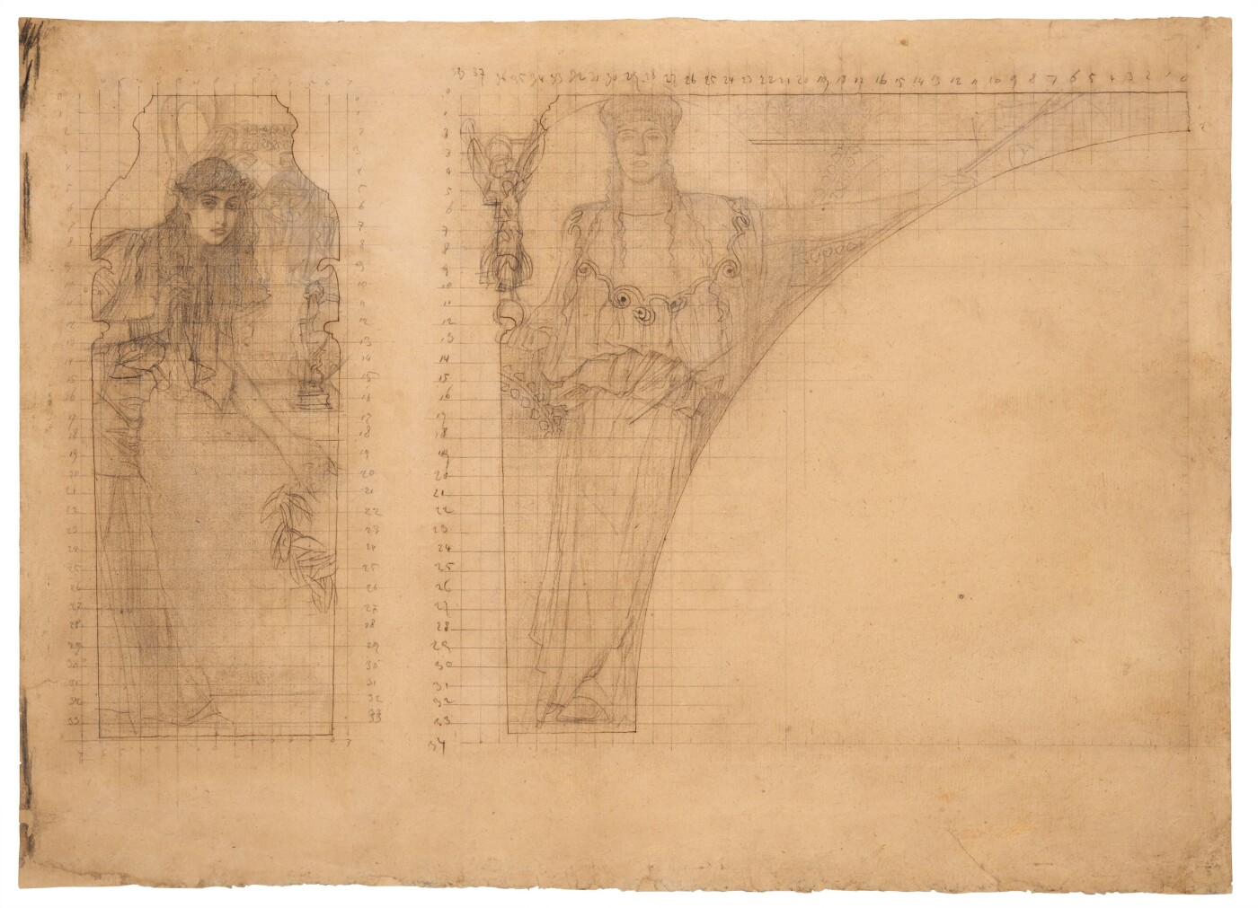1890 übernahmen die Gebrüder Klimt und Franz Matsch die Ausführung von vierzig Zwickelbildern im Stiegenhaus des k. k. Kunsthistorischen Hofmuseums (heute: Kunsthistorisches Museum, Wien). In diesem Zusammenhang entstanden diverse mit Bleistift rastierte Übertragungsskizzen, ausgeführt in schwarzer Kreide. Diese Skizzen sind allesamt äußert detailgetreu ausformuliert. Neben der Positionierung der Figuren und der groben Umrisslinien wurden auch bereits der Faltenwurf der Gewänder sowie die Gesichtszüge komplett vordefiniert. Dieses akribische Vorarbeiten sollte Klimt in späterer Folge zugunsten von schematischeren Vorzeichnungen fallen lassen.