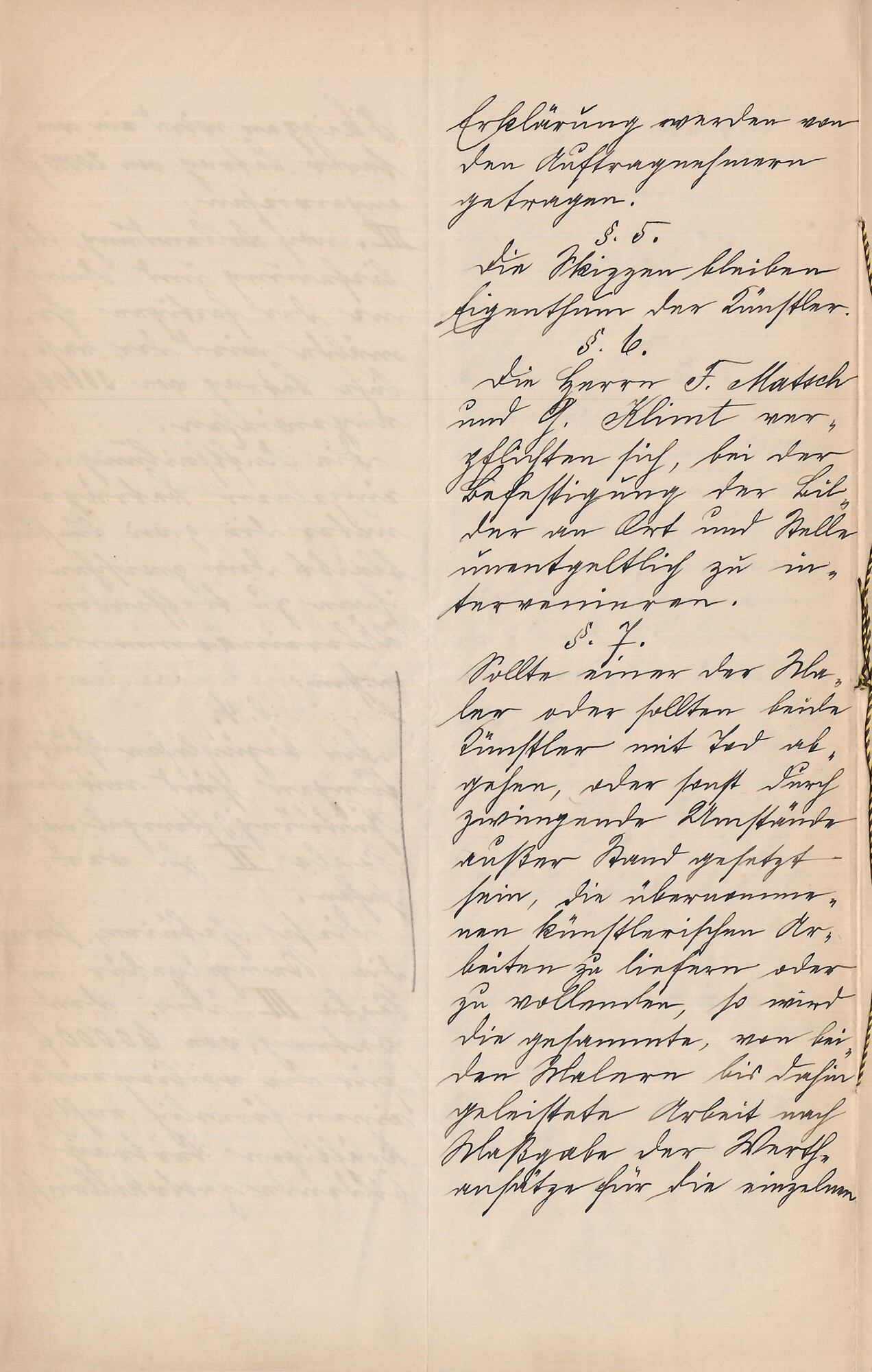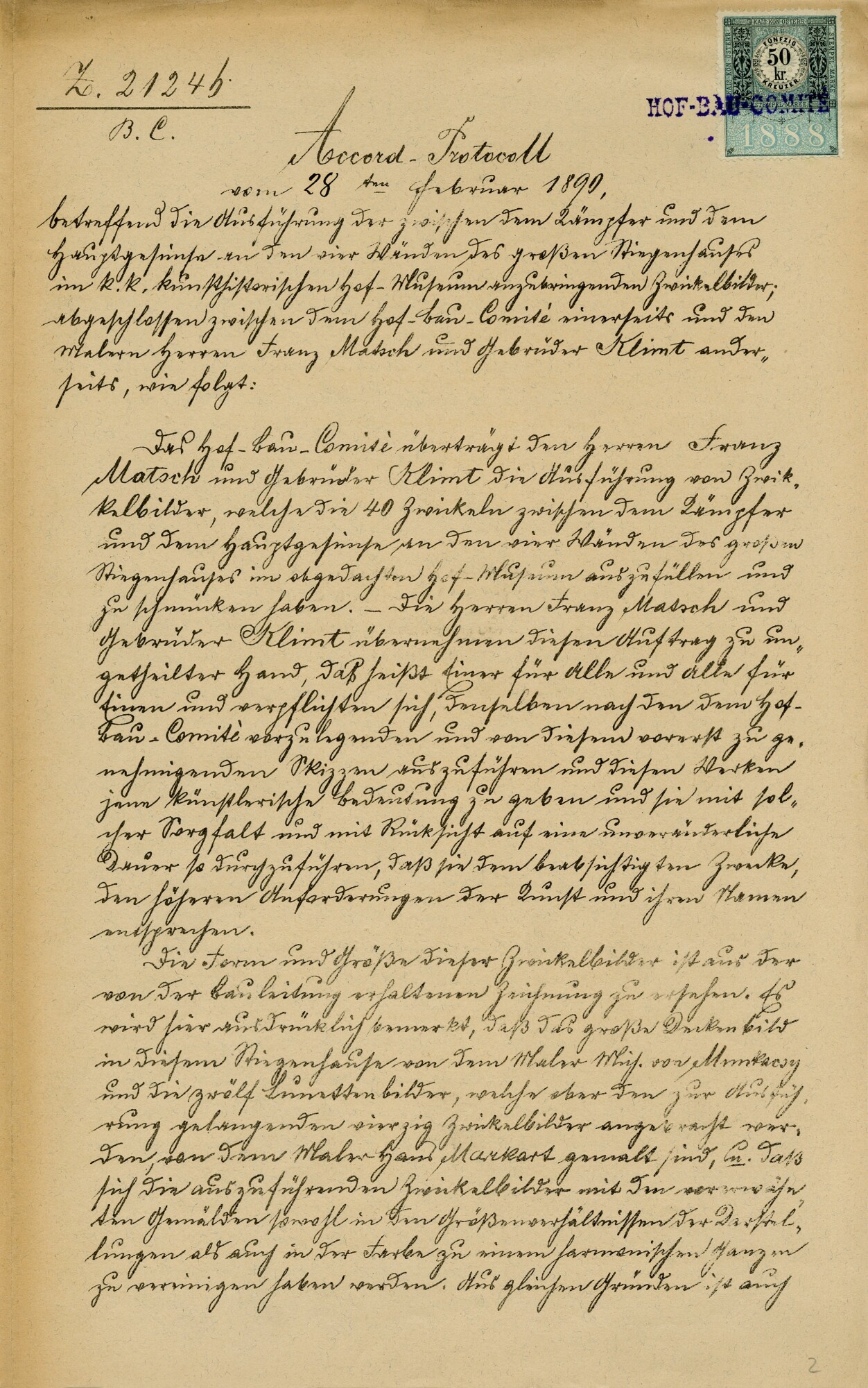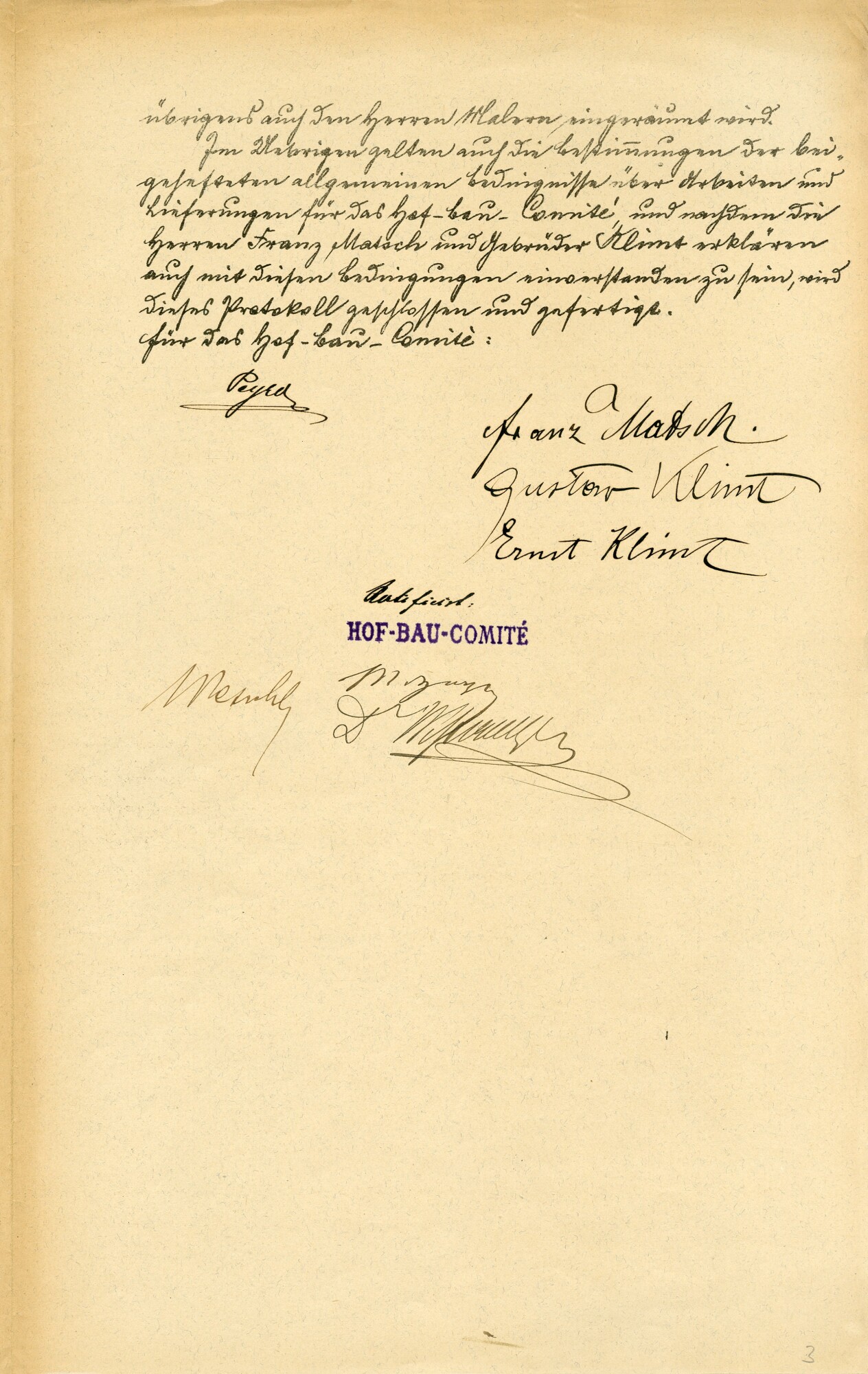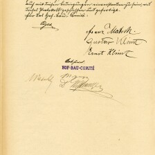 Akkord-Protokoll betreffend die Ausschmückung des Stiegenhauses im k. k. Kunsthistorischen Museum, unterschrieben von Franz Matsch, Gustav und Ernst Klimt und Mitgliedern des Hof-Bau-Comités, 28.02.1890, Österreichisches Staatsarchiv, Allgemeines Verwaltungs-, Finanz- und Hofkammerarchiv (AVA), Ministerium des Inneren, Bestand: Stadterweiterungsfonds, Hofbaukomitee