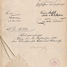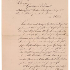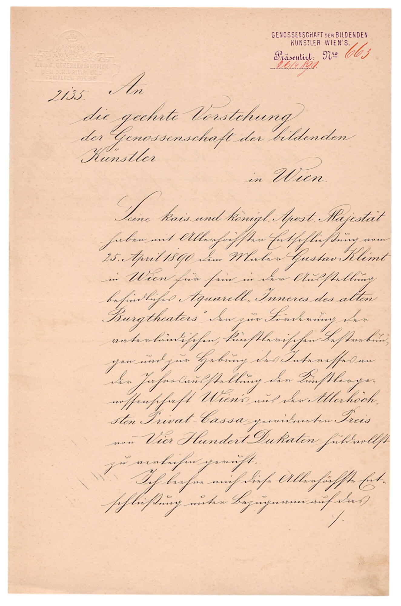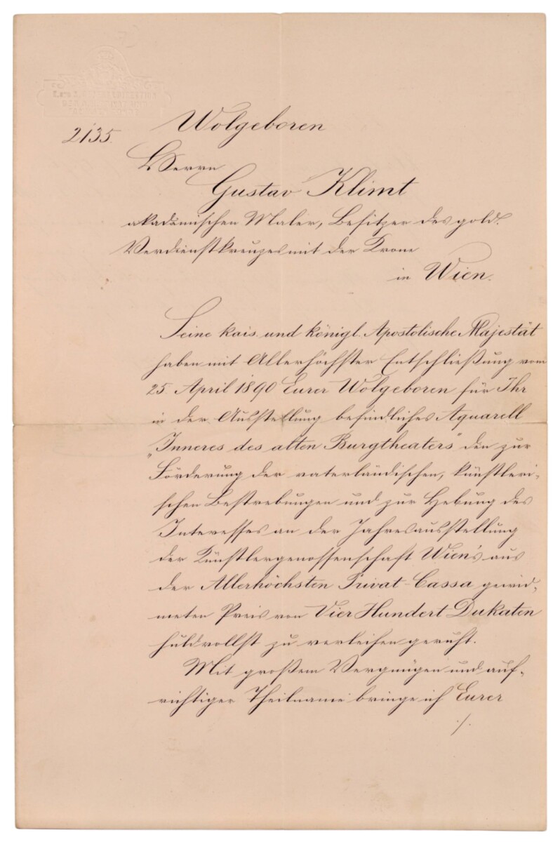 - Brief der k. und k. Generaldirection der A. H. Privat und Familien-Fonde in Wien an Gustav Klimt in Wien, unterschrieben von Hofzahlmeister Mayr (26.04.1890). GKA71.