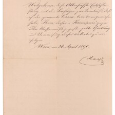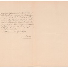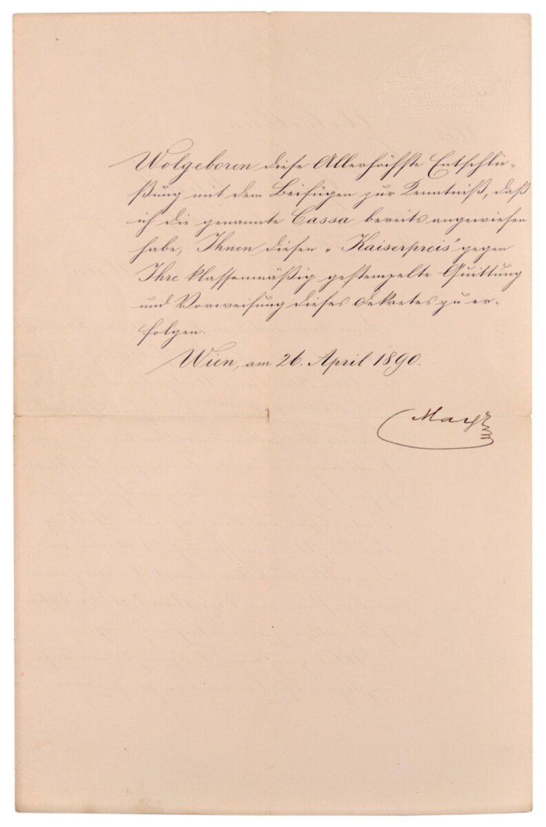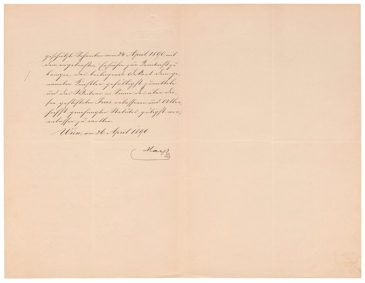 Brief der k. und k. Generaldirection der A. H. Privat und Familien-Fonde in Wien an Gustav Klimt in Wien, unterschrieben von Hofzahlmeister Mayr, 26.04.1890, Albertina