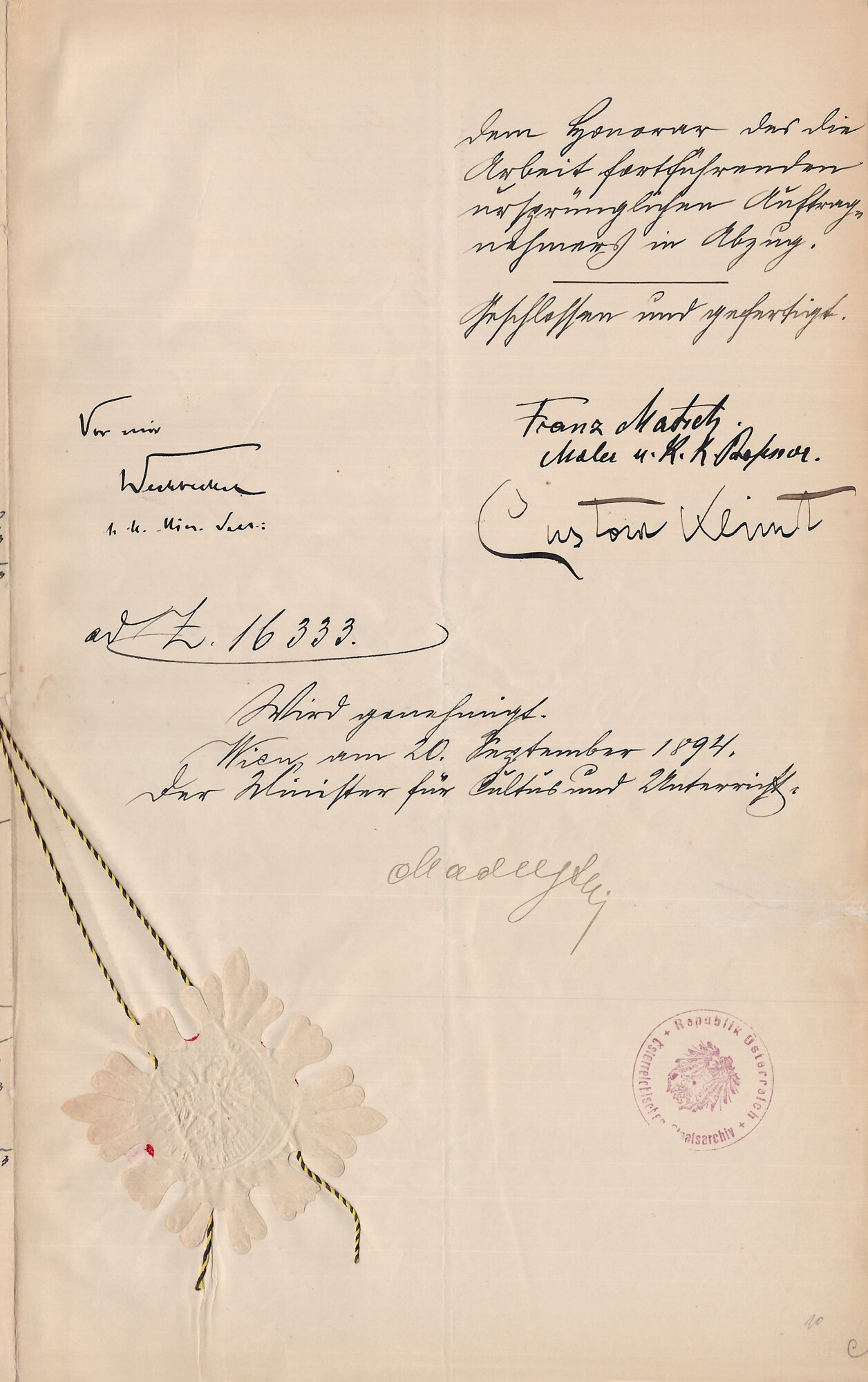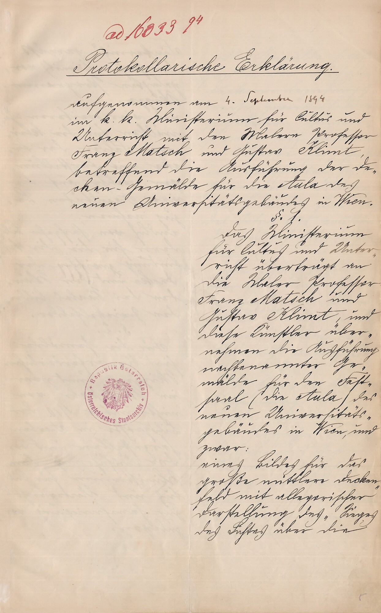 Am 4. September 1894 wurde die Protokollarische Erklärung über die Ausführung der Deckengemälde für die Aula der k. k. Universität Wien im Ministerium mit Klimt und Matsch aufgenommen und am 20. September 1894 genehmigt.