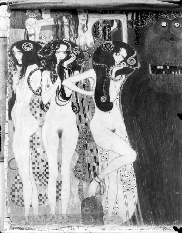 Gustav Klimt: Der Beethovenfries (Die Leiden der schwachen Menschheit, Der wohlgerüstete Starke), 1901/02, Österreichische Galerie Belvedere, Dauerleihgabe in der Secession, Wien