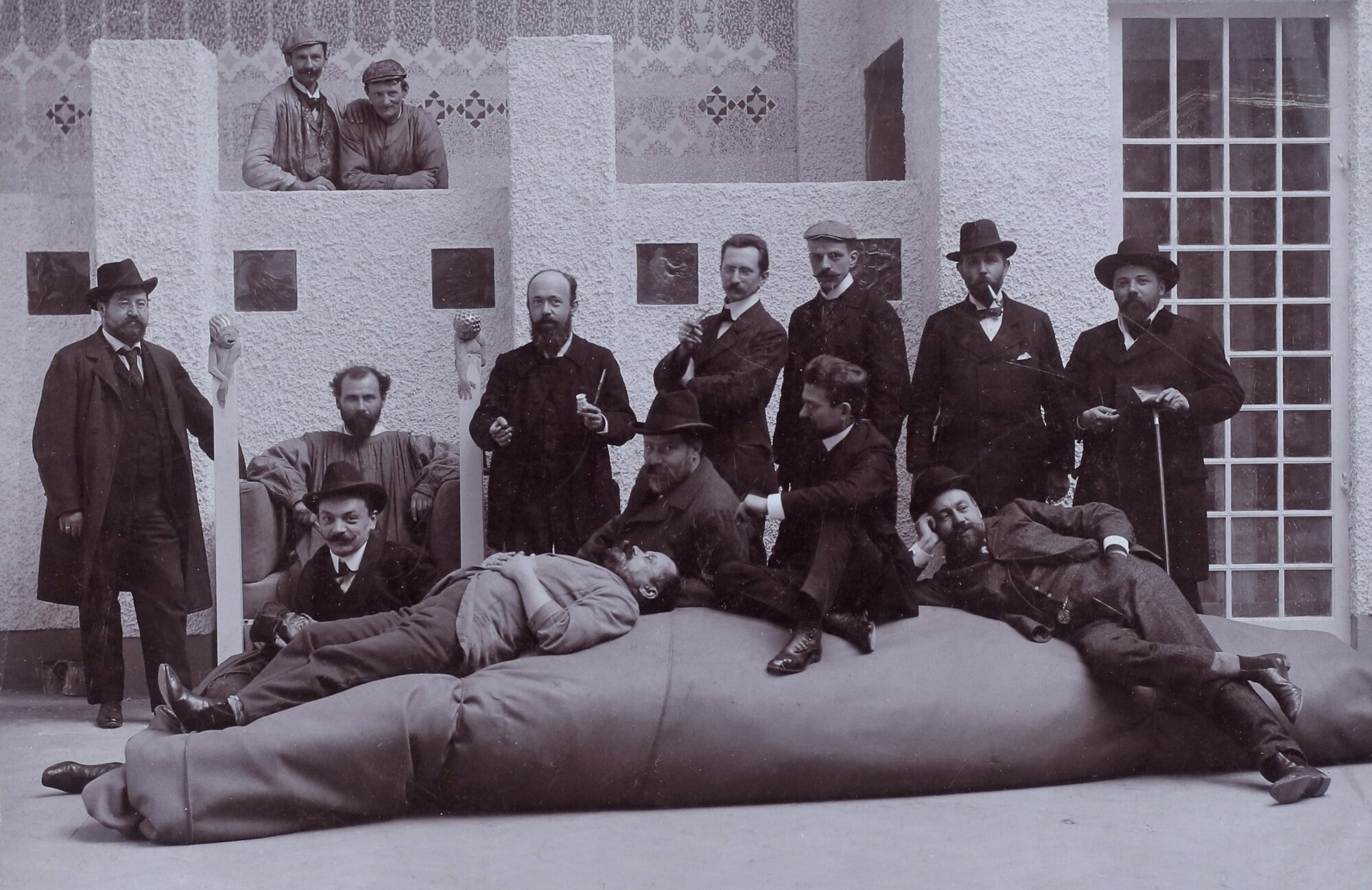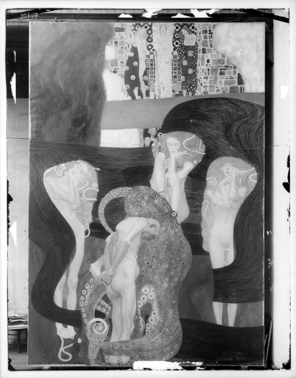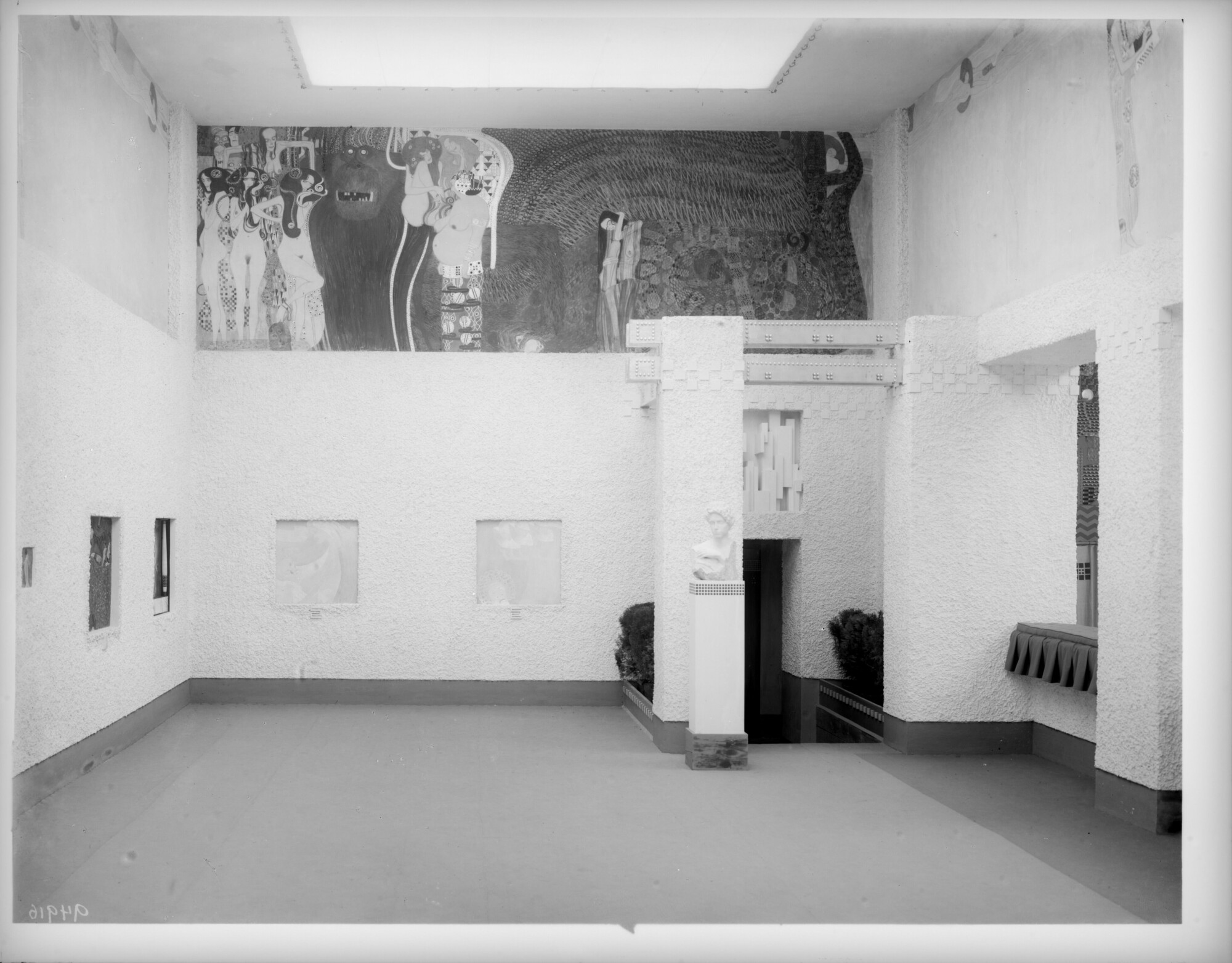 Anlässlich der Präsentation von Max Klingers Monumentalstatue Beethoven in der Wiener Secession 1902 schuf Gustav Klimt den sogenannten Beethovenfries. In Kaseinfarben direkt auf drei Ausstellungswände gemalt, führte der Maler inhaltlich auf die zentrale Skulptur hin und leistete mit dem Fries einen Beitrag zum Gesamtkunstwerk. Obschon Ludwig van Beethoven im Titel erwähnt wird, ist der Komponist nicht dargestellt.
