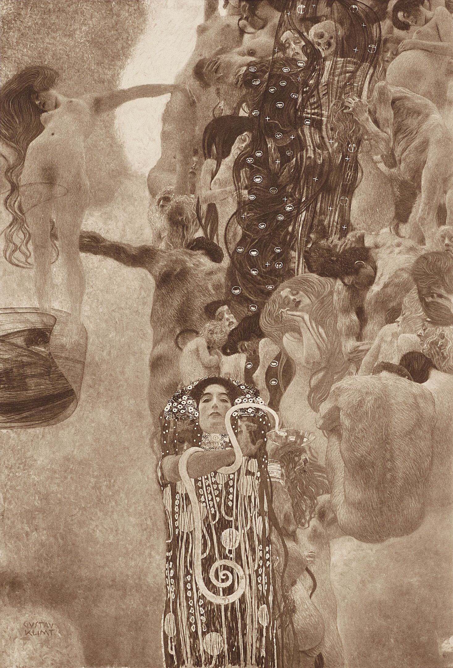 In den Jahren zwischen 1900 und 1903 arbeitete Gustav Klimt intensiv an den beiden Fakultätsbildern Die Medizin und Die Jurisprudenz für die Aula der Universität Wien. Die Gemälde sorgten im Zuge der Erstpräsentationen 1901 und 1903 für Skandale, wie bereits 1900 Die Philosophie. Nach zahlreichen Änderungen und Ergänzungen bis 1907 verbrannten die Werke 1945 in Schloss Immendorf.