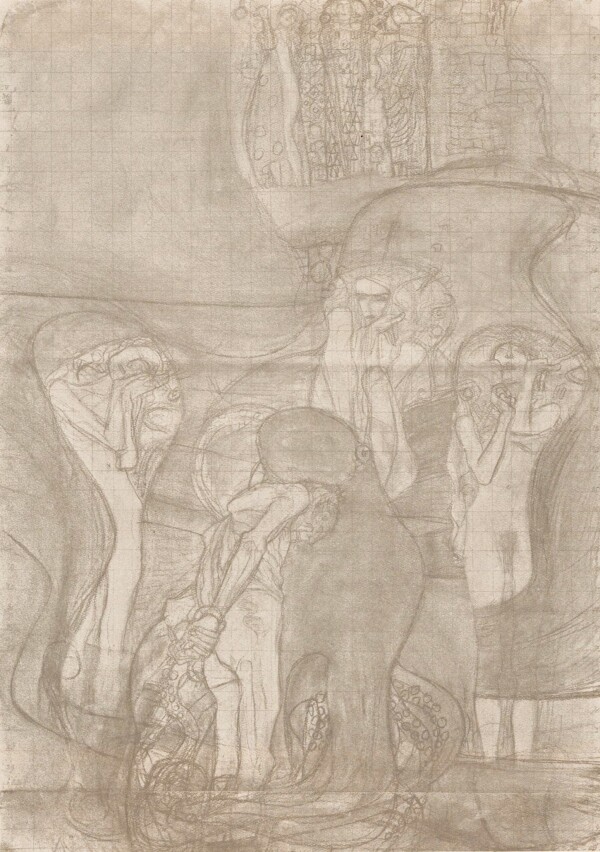 Die Studien für den Beethovenfries (1901/02, Belvedere, Wien) bilden im zeichnerischen Œuvre Klimts ein zusammenhängendes Konvolut. Klimt begann bereits im Sommer 1901 mit den ersten Skizzen für den monumentalen Fries, der 1902 auf der »XIV. Secessionsausstellung«, die Max Klinger und Ludwig van Beethoven gewidmet war, gezeigt werden sollte. Von den rund 300 Figurenstudien sind heute noch etwa 125 Entwurfsarbeiten auf Papier bekannt. Blätter die rechts unten mit R bezeichnet sind, stammen vermutlich aus dem Besitz von Carl Reininghaus, dem Erstbesitzer des Frieses. Eine Auswahl davon gelangte, wie auch der Fries selbst, in die Sammlung Lederer, wo sie Klimt nachträglich mit seiner Signatur versah.