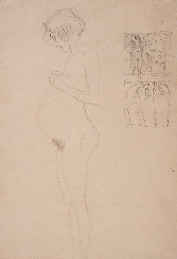 Die Auseinandersetzung Klimts mit dem Themenkreis Geburt und Tod im Gemälde Hoffnung I (1903/04, National Gallery of Canada, Ottawa) wird häufig mit dem frühen Tod seines unehelichen Sohnes Otto Zimmermann am 11. September 1902 begründet. Dem Gemälde ging eine umfangreiche Serie von Studien mit hochschwangeren Frauen, teilweise auch in der schützenden Umarmung eines männlichen Partners, voraus. Klimt zeigt diese im Profil, sodass der gewölbte Bauch im Zentrum der Komposition liegt. Aufgrund der stilistischen Nähe zu den Zeichnungen für den Beethovenfries werden die Skizzen um 1902 datiert. Zunehmend beginnen die Darstellungen den Rahmen zu überschneiden, sowohl Köpfe als auch Füße werden zumeist unvollständig wiedergegeben. Dies hatte zur Folge, dass Klimt in den kommenden Jahren auf ein größeres Blattformat umsteigen sollte. Auffallend an der Serie ist außerdem, dass Klimt sein Spektrum um das Medium Farbstift in Rot und Blau erweiterte. Neben der weichen Kreide und dem harten Bleistift griff der Maler noch zu Packpapier – wenige Jahre später zeichnete er die Skizzen für Hoffnung II bereits auf kostspieligerem Japanpapier.