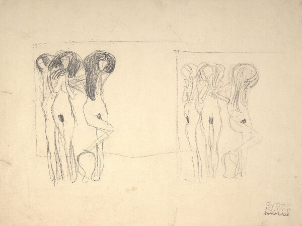 Zwei Kompositionsskizzen zu den Drei Gorgonen (1901, Albertina, Wien, Inv. 39315, S 1980: 802) stellen nicht nur motivisch, sondern auch funktional eine Ausnahme in diesem sonst in sich geschlossenen Schaffensprozess dar. Die Studie ist eine der wenigen erhaltenen schematischen Darstellungen, die sich rein auf die kompositorische Zusammenstellung der Figuren und nicht auf deren Aussehen im Detail als Einzelfigur fokussiert. Zudem wählte Klimt für diese flüchtige Überblicksskizze nicht das Medium Kohle, sondern den für schnell gesetzte Skizzen besser geeigneten Bleistift.