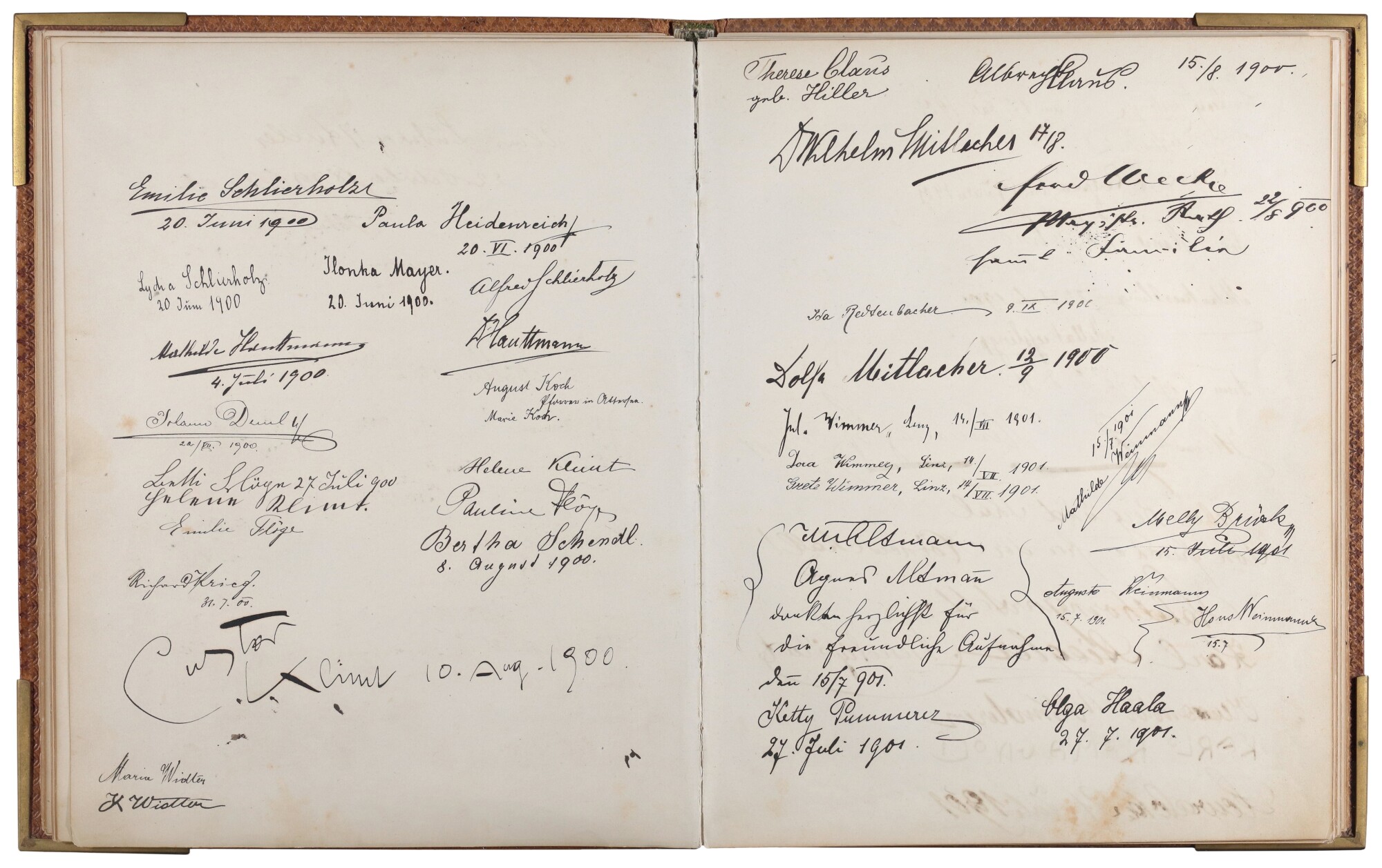 Gustav Klimt: Eintrag von Gustav Klimt und der Familie Flöge im Gästebuch der Villa Paulick in Seewalchen am Attersee, 10.08.1900, Sammlung Villa Paulick, courtesy Klimt-Foundation, Wien