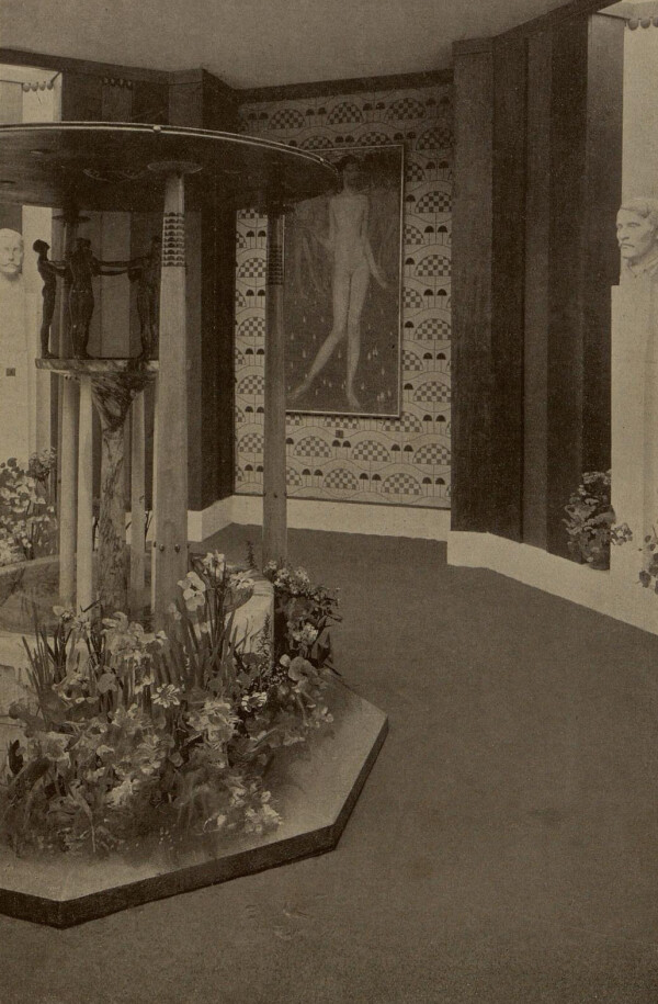 Elena Luksch-Makowskys Gemälde Adolescentia neben dem Brunnen ihres Mannes Richard Luksch auf der XVII. Secessionsausstellung, 1903, in: Das Interieur. Wiener Monatshefte für angewandte Kunst, 4. Jg. (1903).