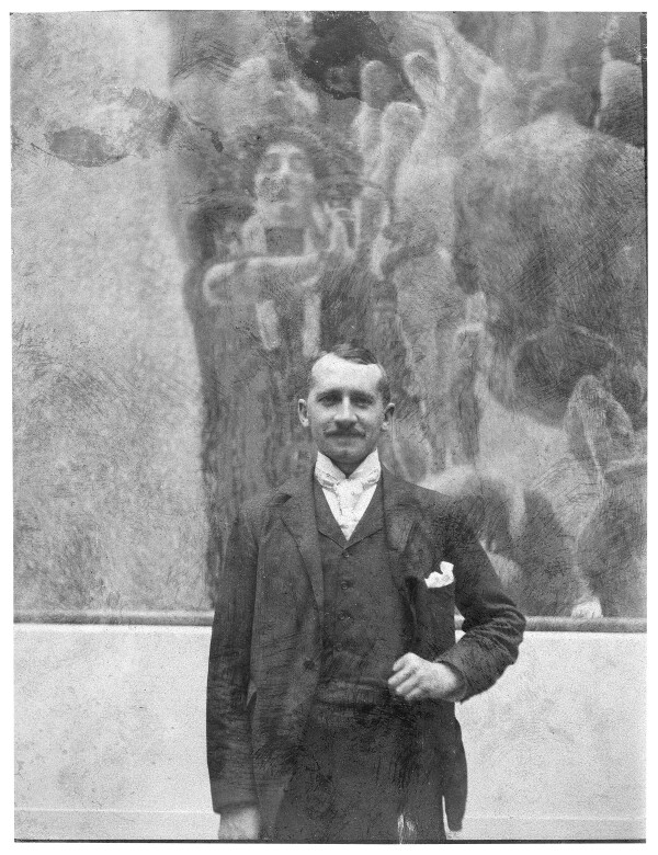 Hans Watzek (?): Die Medizin, vermutlich Juni 1901 - Oktober 1901, Privatbesitz: Josef Maria Auchentaller vor Gustav Klimts »Medizin« auf der »VIII. Internationalen Kunstausstellung im königlichen Glaspalast zu München«, 1901, Privatbesitz