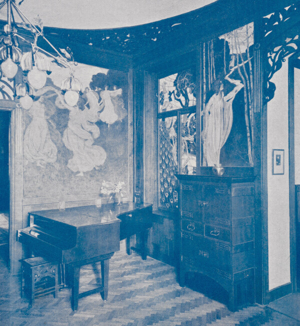 Musikzimmer im Haus von Georg Adam Scheid, um 1901, in: Vereinigung bildender KünstlerInnen Wiener Secession (Hg.): Ver Sacrum. Mitteilungen der Vereinigung bildender Künstler Österreichs, 4. Jg., Heft 8 (1901).