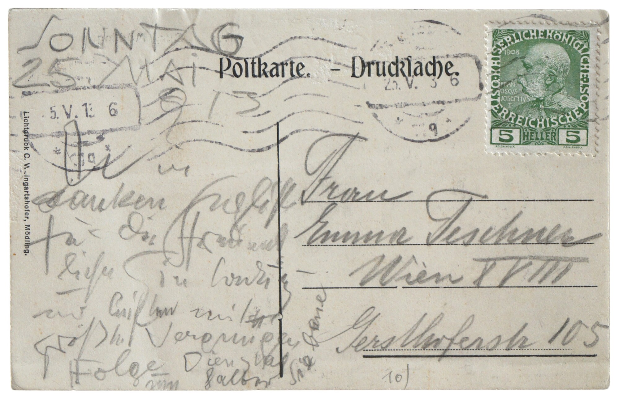 Gustav Klimt: Ansichtskarte von Gustav Klimt an Emma Bacher-Teschner in Wien, mitunterschrieben von Emilie Flöge, 25.05.1913, Klimt-Foundation