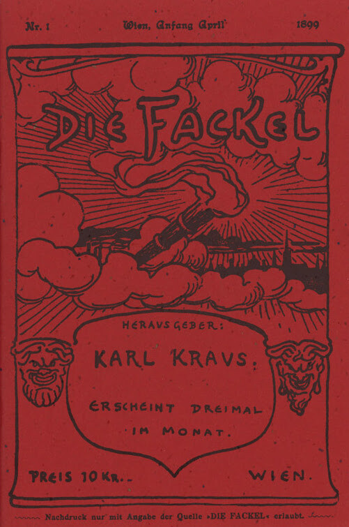 Kraus begann schon bald in Wien als Tagesschriftsteller zu arbeiten und verfasste unter anderem als Korrespondent zahlreiche Artikel und Rezensionen für Zeitschriften im deutschsprachigen Raum. Im Alter von 25 Jahren gründete er schließlich seine eigene Zeitschrift: Die Fackel. Sie erschien vom 1. April 1899 bis Juli 1904 regelmäßig und dann bis zu seinem Tod in lockerer Folge in über 900 Nummern. Die Fackel avancierte in der Zeit zu einem wichtigen Medium und Forum der kritischen Wiener Moderne.