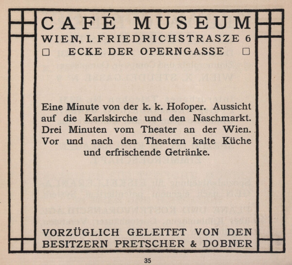 Werbung für das Café Museum, in: Vereinigung bildender Künstler Österreichs Secession (Hg.): XX. Ausstellung der Vereinigung bildender Künstler Oesterreichs Secession Wien. März April Mai 1904, Ausst.-Kat., Secession (Wien), 26.03.1904–12.06.1904, Wien 1904.