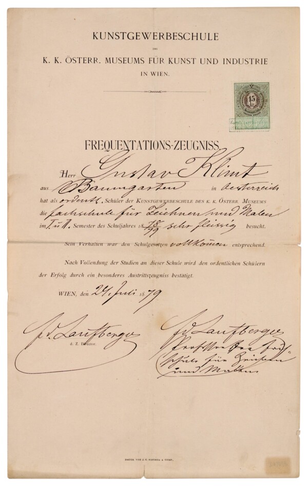 Frequentations-Zeugnis der k. k. Kunstgewerbeschule in Wien für Gustav Klimt, ausgefüllt und unterschrieben von Ferdinand Laufberger, 24.07.1879, Albertina