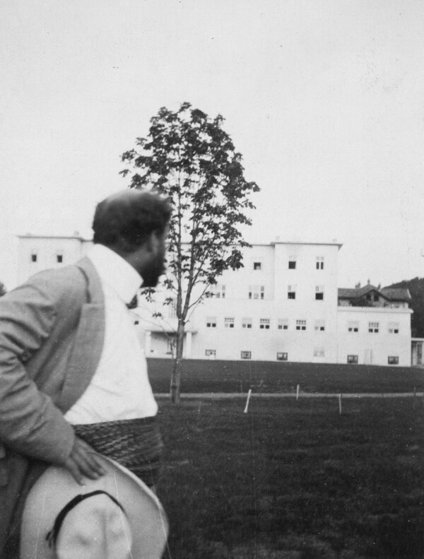 Gustav Klimt vor dem Sanatorium Westend in Purkersdorf, vermutlich 1905, MAK - Museum für angewandte Kunst, Archiv der Wiener Werkstätte