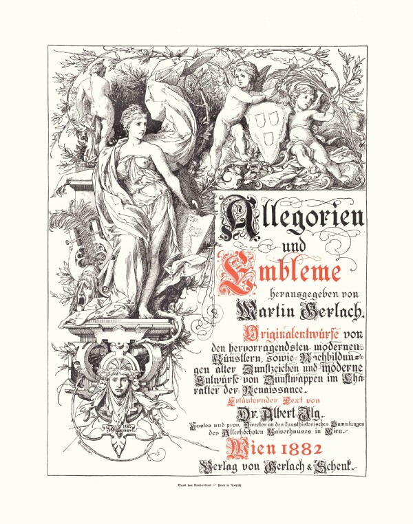 Front page, in: Martin Gerlach (Hg.): Allegorien und Embleme. Originalentwürfe von den hervorragendsten modernen Künstlern, sowie Nachbildungen alter Zunftzeichen und modernen Entwürfen von Zunftwappen im Charakter der Renaissance. Abtheilung I. Allegorien, Vienna 1882/84.