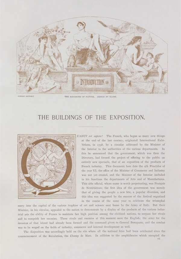 The American painter and art writer William Walton had also become aware of the two allegories by Gustav Klimt and included them in his exhibition guide “Chefs-d’œuvre.” In the introductory section, he used The Realms of Nature, adapting the presentation to his needs by changing the inscription on the plaque from “The Realms of Nature” to “Introduction,” the subtitle of the volume in question. In the second volume, Walton eventually also depicted Allegory of Idyll. Thus, these two works were the first works by Klimt to be disseminated beyond the German-speaking world.