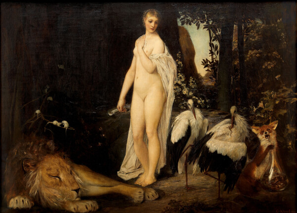 He also painted the two oil paintings Allegory of Fable (1883, Wien Museum, Vienna) and Allegory of Idyll (1884, Wien Museum, Vienna). In both works, the allegories were personified as idealized female figures. The personification of Fable holds a scroll in her right hand. She is accompanied by two pairs of animals, a lion with mice and a fox with a stork. Both motifs are borrowed from Aesop’s ancient fables and represent human behavior in the manner of parables.