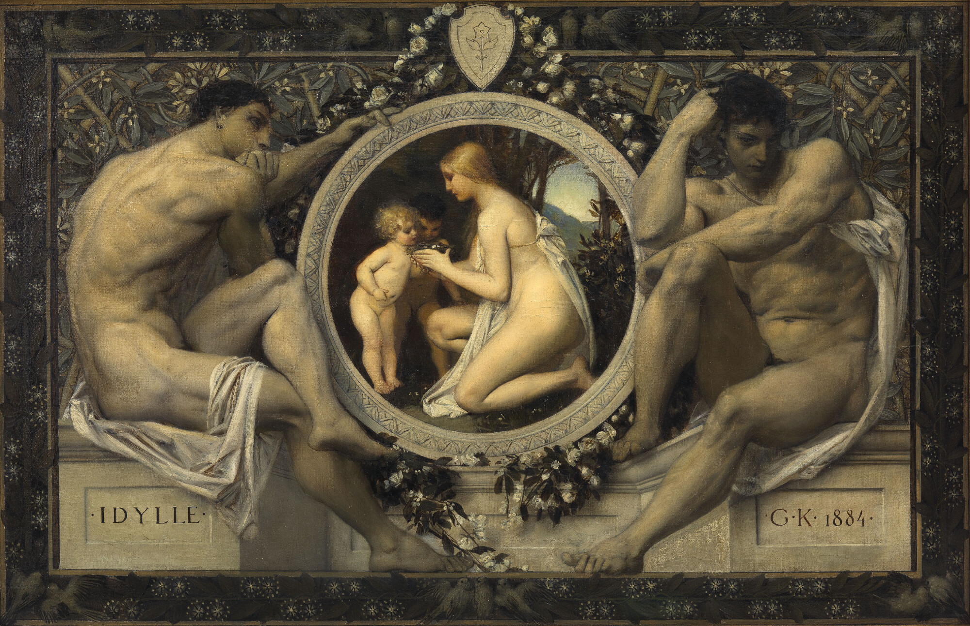 For Allegory of Idyll, Gustav Klimt chose an architectural and figurative frame, which reminded contemporaries of Michelangelo’s ceiling in the Sistine Chapel. Klimt depicted the allegory of Idyll as a woman with children gathered around a nest filled with eggs. Like in Allegory of Fable, the landscape in the background is rendered as a cursory vista. Allegory of Idyll represents a picture within a picture, with a medallion surrounded by a floral wreath and held up by two muscular male nudes doubtlessly inspired by Michelangelo’s Ignudi (1508–1512, Sistine Chapel, Vatican City). They sit on a stone parapet bearing the title, a monogram and the date.