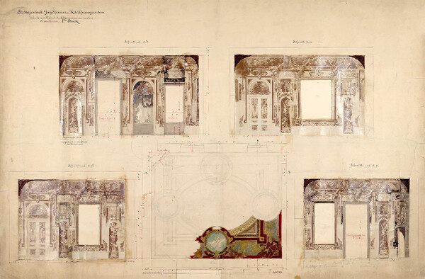 Just who recommended the artists of the “Künstler-Compagnie” to the building contractors at the time has not yet been ascertained. Most likely, the artists received the commission via the Vienna-based company of Joseph Kott, which was tasked with the castle’s decor. Acting as Kott’s subcontractors, the three young artists created cartoons – according to Franz Matsch there were nine – for sgraffiti in the inner courtyard, showing depictions from the Legend of the Nibelung. Seeing as this inner courtyard was roofed around 1900, and later converted, the sgraffiti are now lost.