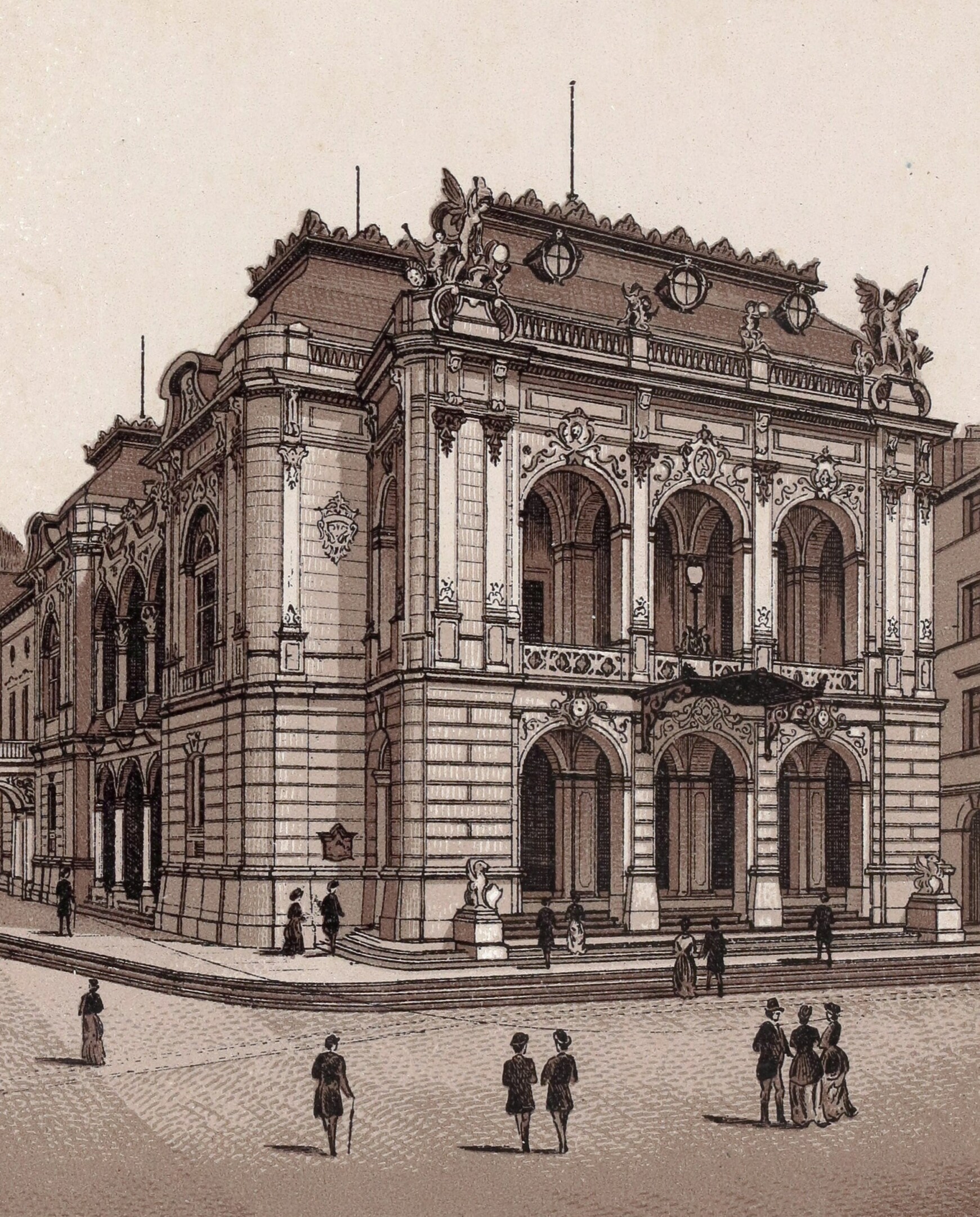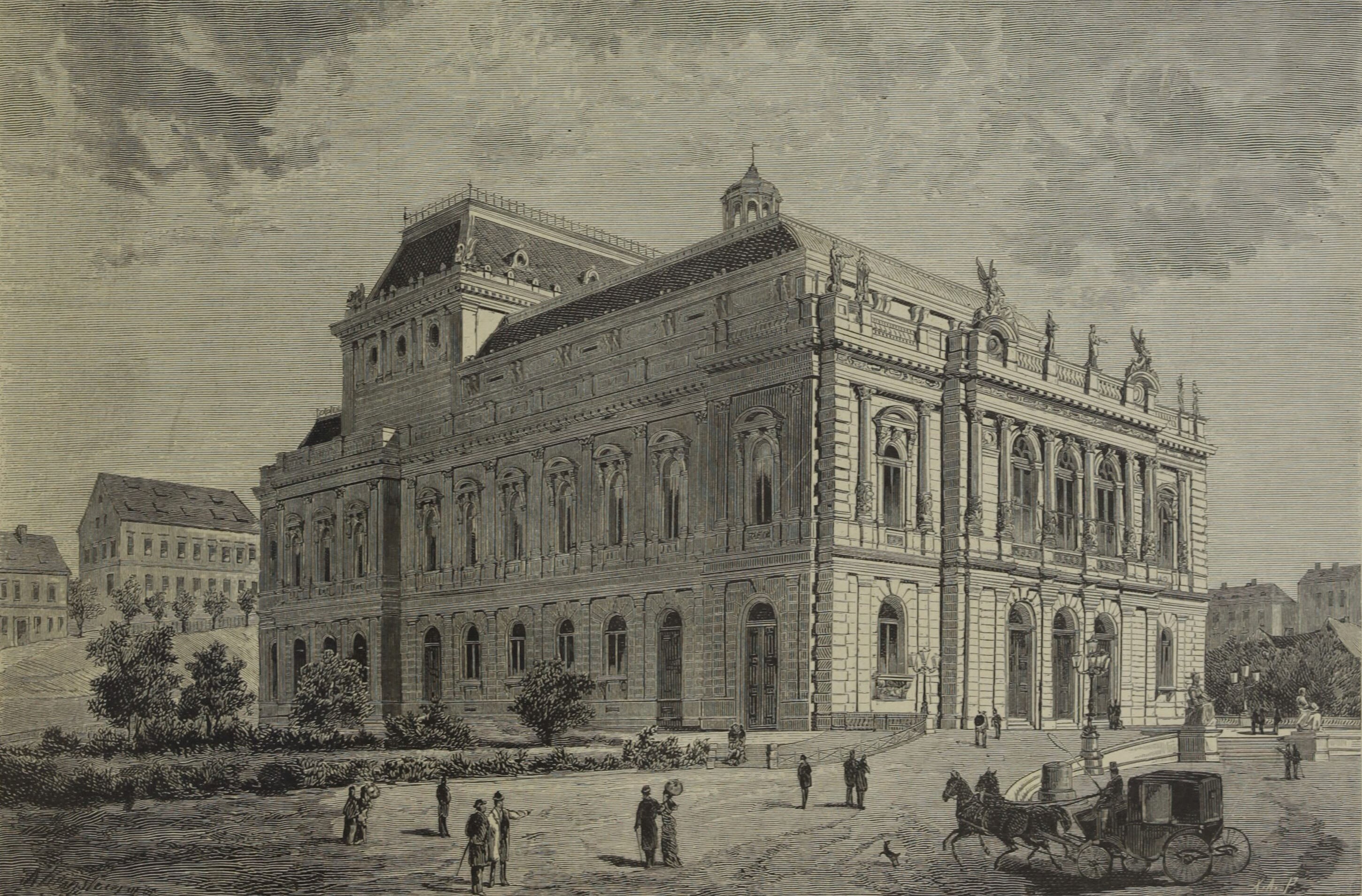 In June 1881, the city of Reichenberg (now Liberec, Czech Republic) entered into a contract with the two famous Viennese architects Ferdinand Fellner Jr. and Hermann Helmer, commissioning them to erect a new municipal theater (now F. X. Šalda-Theater), which was to open as early as the autumn of 1883. According to the newspaper Die Presse, dated 23 June 1881, Fellner & Helmer were asked to submit their detailed plans and cost estimate by the end of August, as the city intended for construction to start in the autumn. Various media reports indicate that the requested documents were submitted to the municipality in early September. Fellner & Helmer personally presented the plans for the theater, which they designed as a free-standing building, to the city council in Reichenberg. The newspaper Wiener Allgemeine Zeitung reported on 8 September 1881 that “the city councilors announced the construction of the new theater according to the architects’ much-lauded plans […].” The budget for the building project, which was to last several years, was set for 230,000 guilders (c. 3,234,000 euros), but, in the end, exceeded the sum of 300,000 guilders (c. 4,219,000 euros).