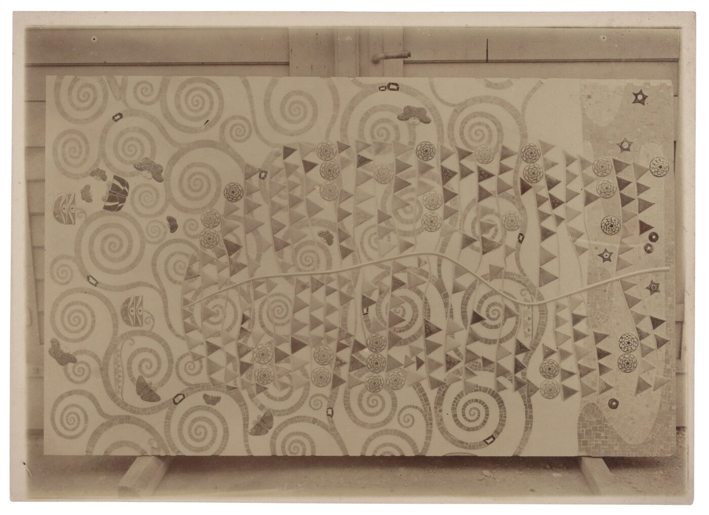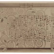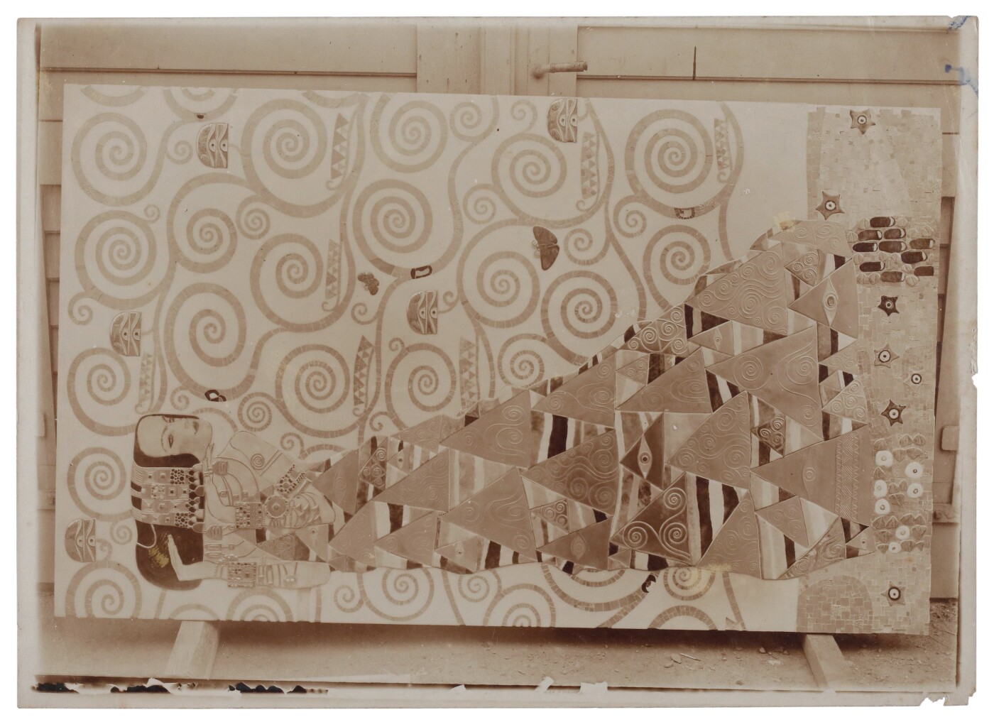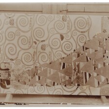 In October 1911, two panels of the Stoclet Frieze (1905–1911, private collection) were on view for a brief period at Leopold Forstner’s Vienna Mosaic Workshop. The Viennese public should get a chance to see the two panels before they would be delivered to Brussels to be installed in their destination, the dining room of the Stoclet Palace. It was probably because transport of these panels, measuring two by seven meters, should be avoided that they were put up in the workshop where they had been manufactured. Judging from a description in an article that appeared in the Arbeiterzeitung of 29 October, the two panels presented were Dancer and Rosebush. Two photographs show these fragments of the frieze leaning against a door. The pictures, which had probably been taken by Moriz Nähr, seem to have been photographed at Forstner’s workshop shortly before the departure of the two works to Brussels. The two panels were received highly favorably: