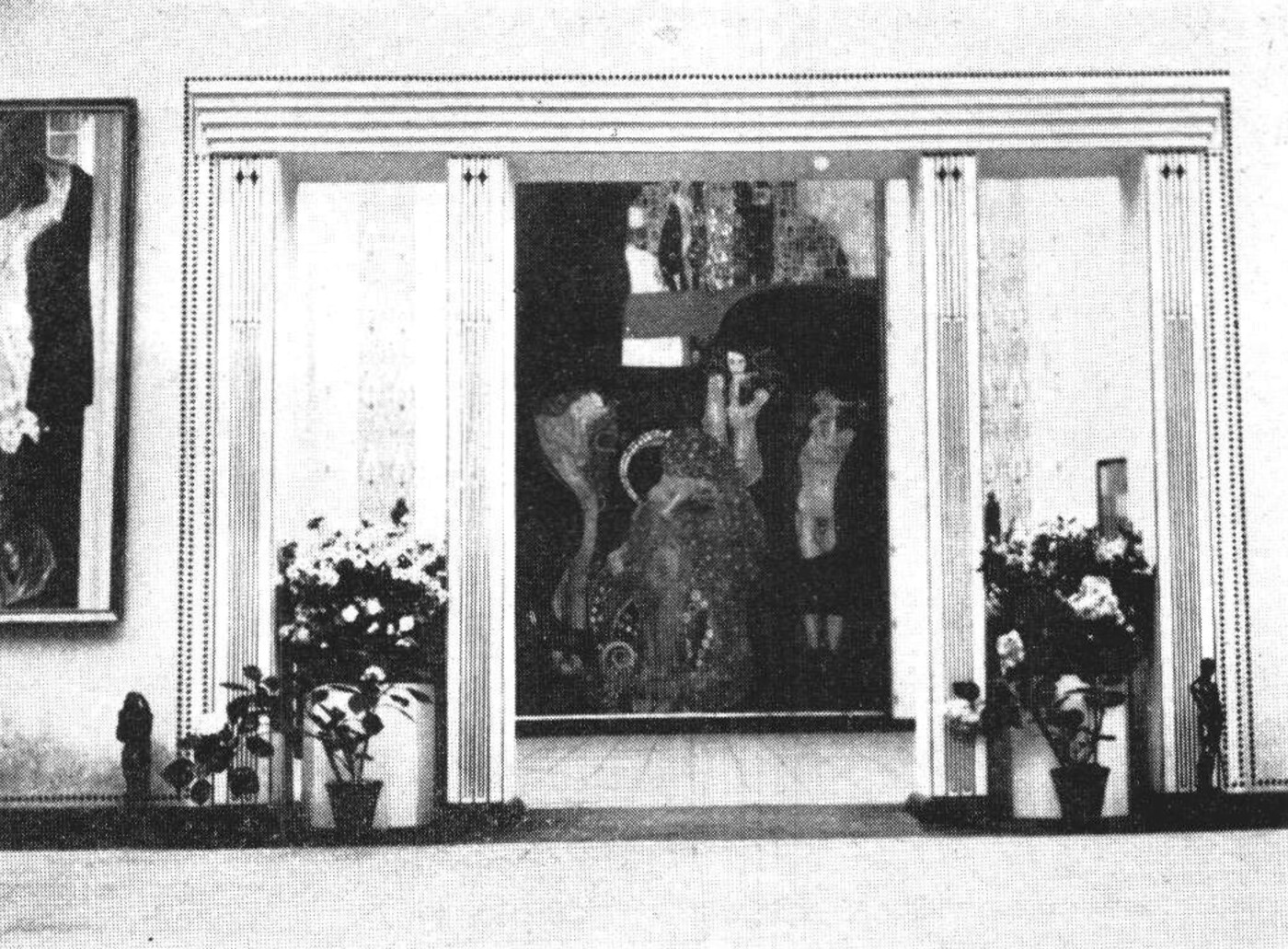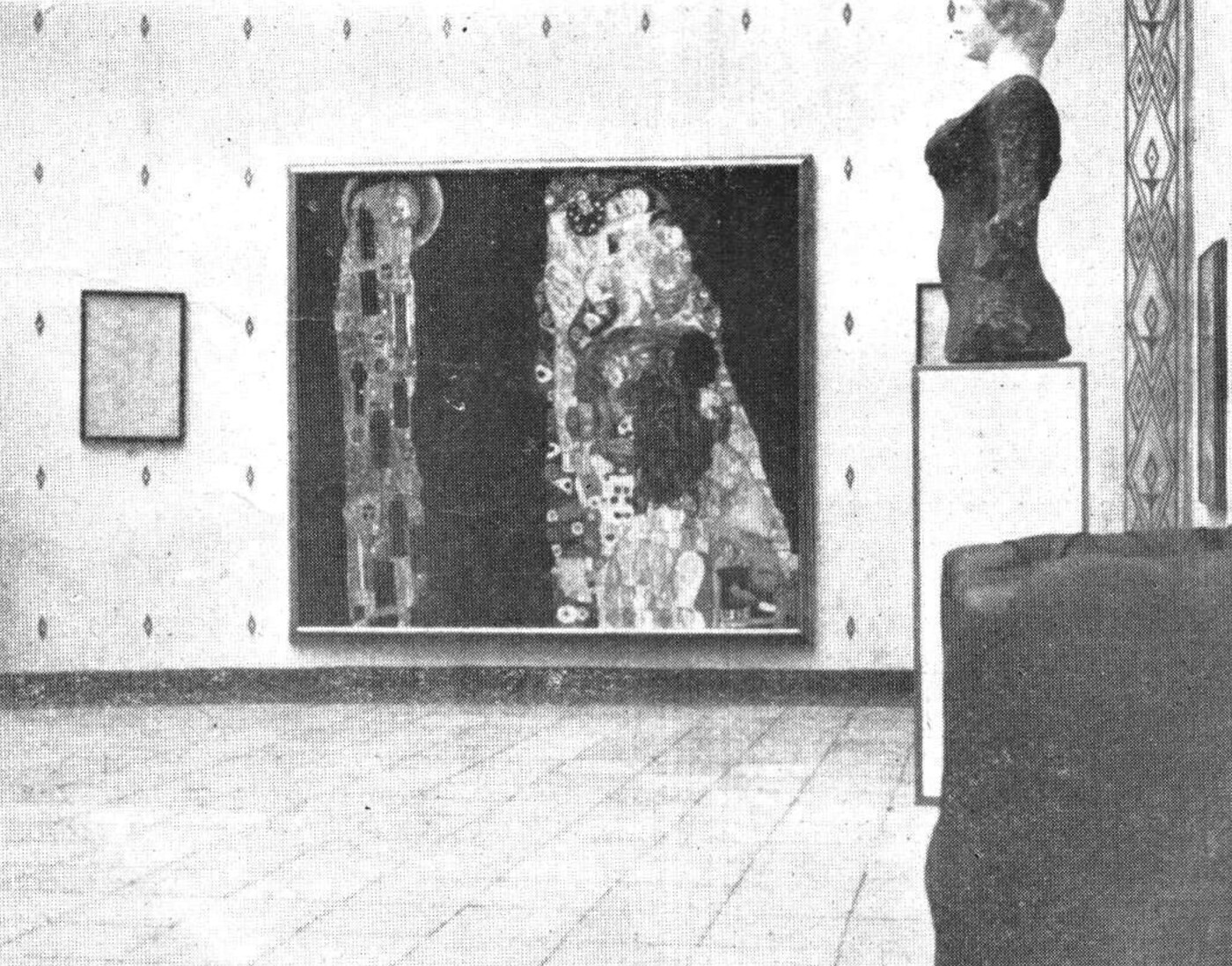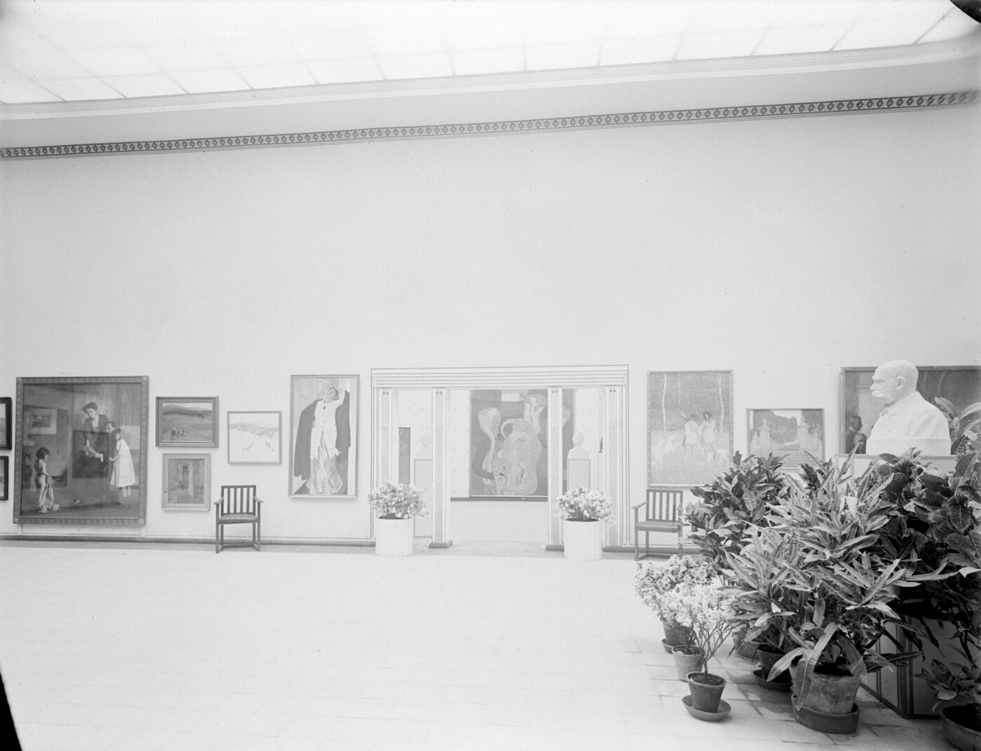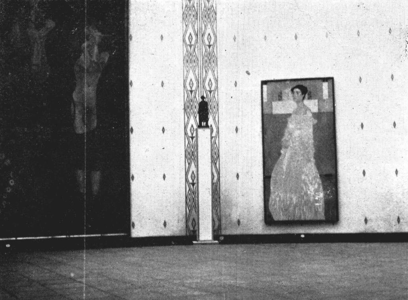 Numerous photographs taken in 1911 document the Austrian Pavilion from the inside and outside. Some of them also show views of the Klimt Room, with Jurisprudence (1903, final version 1907, destroyed by fire at Immendorf Castle in 1945) placed prominently directly opposite the entrance. The series of photographs was published that same year in a special portfolio edited by Verlag Brüder Rosenbaum.