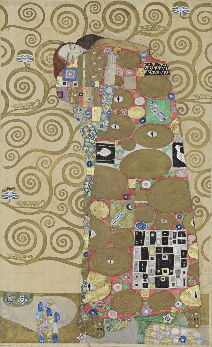 Klimt obviously wished to finish the second version before the opening of a planned exhibition in Budapest on 8 March. Unfortunately, there is no photographic evidence of the condition in which the painting was shown there. With the alterations made, the name of the work changed as well. Whereas it had previously been exhibited under the title of “Death and Life,” from 1913 on it was referred to as “Death and Love.” The new title indicates that the changes were not only made for aesthetic and compositional reasons, but they also point to the artist’s new objective in terms of content.