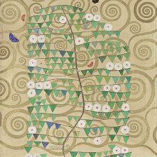 The color scheme seems surprising, as at the same time Klimt was still working on the designs for the Stoclet Frieze (MAK – Museum für angewandte Kunst, Vienna). Large amounts of gold leaf, which over the years had lent its name to Klimt’s Golden Period, gave way to a bright palette in 1910. In Death and Life (Death and Love), Klimt employed the colors according to their symbolic meaning. He used the cold, dark colors of blue, violet, and green, supplemented by black and white, to paint the Grim Reaper’s robe, interspersed with a multitude of crosses. By contrast, he chose warm colors, mostly shades of red, pink, and orange, for the side of Love and Life. The only exception is the garment of the aged woman, who, having arrived at the end of life, is already assigned to the sphere of Death in terms of color.