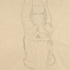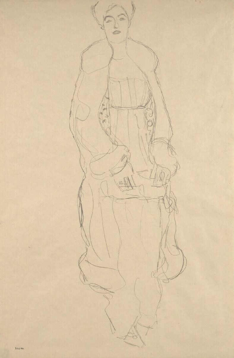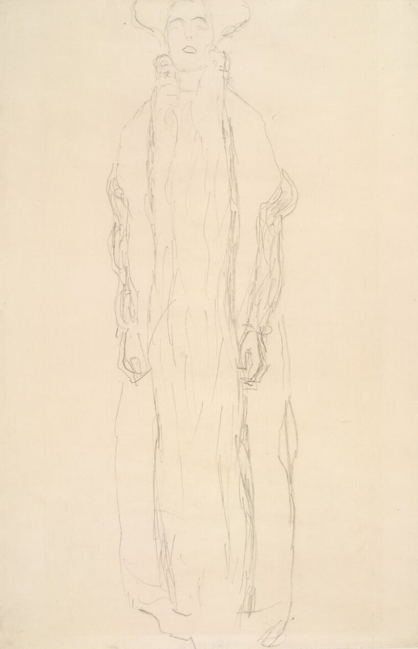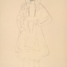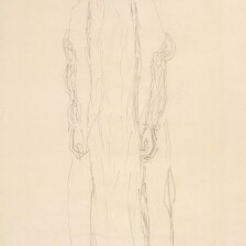 Klimt’s distinctive late style is evident also in the preliminary drawings for his female portraits of this time. The work on paper Standing Woman from the Front (1911, Albertina, Vienna, S: 1982: 2069), one of the many preparatory studies for the work Portrait of Paula Zuckerkandl (1912, whereabouts unknown), captivates with its clearly defined outlines which, like in the aforementioned, more detailed study, invest the model with form and volumes. He rendered the standing figure of Zuckerkandl from a slight bottom-view perspective. Due to Klimt’s emphasized outlines and the coiling folds of the dress, she appears weightless. Through his clear definition, Klimt invested the portrayed with an enormous presence already in the preliminary drawings.