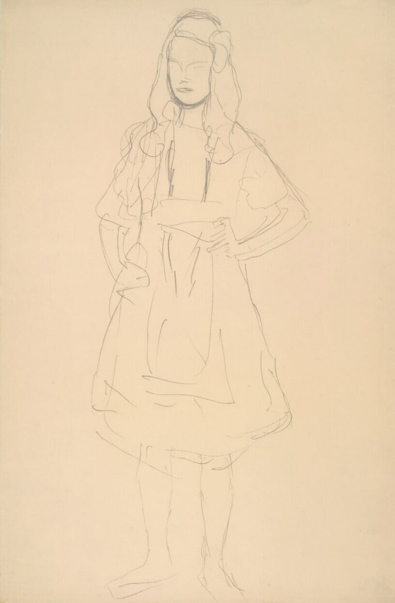 Along with these portraits of important female patrons, Klimt also created a series of remarkable drawings and preparatory studies showing Mäda Primavesi in seated and standing poses. In the study Standing Slightly towards the Left, Hands on Hips (1912/13, Albertina, Vienna, S: 1980: 2125), he precisely captured the model’s natural stance as an expression of her current mood with fleeting, dashed lines. In contrast to the studies for the portraits of Paula Zuckerkandl and Adele Bloch-Bauer, Klimt reduced the strength of the pencil stroke in order to highlight the girl’s delicate youthfulness. This and further works from this time impress as the result of an ephemeral viewing experience and as autonomous artworks.