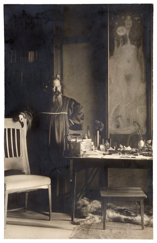 In 1900, Bahr entrusted Josef Maria Olbrich with the design of his villa in the suburb of Ober Sankt Veit, and he bought Klimt’s painting Nuda Veritas (1899, Österreichisches Theatermuseum, Vienna), a work controversially discussed in public. It was prominently placed on a wall in his study. In the door to this room, he also integrated Klimt’s drawing Witch in a small frame. The villa became a meeting point for artists, including Klimt, Otto Wagner, and Gustav Mahler, among others.