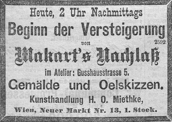 Advertisement for the auction of Makart's estate, in: Neues Wiener Tagblatt, 26.03.1885.