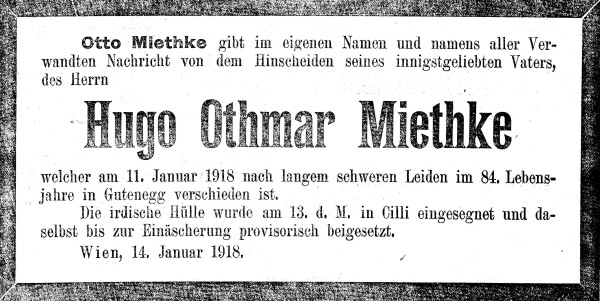 Miethke’s wife Anna (née von Carpentier) died aged only 32 in 1869. In 1881, he married Marie Canzi, the daughter of the painter August Canzi, in the Lutheran City Church, which was located near his gallery in Vienna’s 1st District. Their son Otto Maria Miethke studied with Kolo Moser at the Vienna School of Arts and Crafts and made a name for himself as a painter, graphic artist and lyricist. Hugo Othmar Miethke died at Gutenegg Castle near Cilli (now Celje, Slovenia) on 11 January 1918.