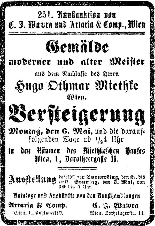 Advertisement for the auction of Hugo Othmar Miethke's estate in 1918, in: Neues Wiener Journal, 02.05.1918.