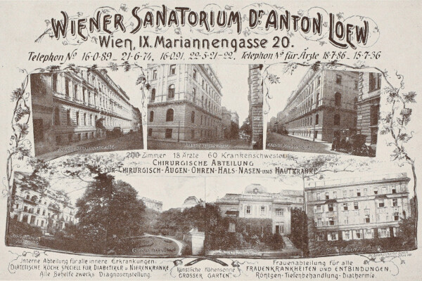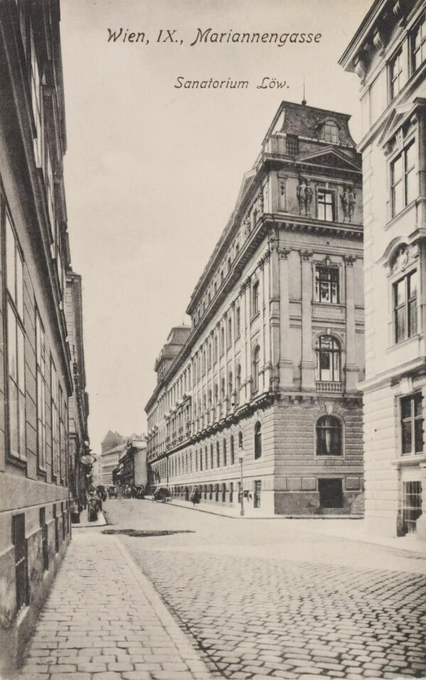 The physician headed Sanatorium Loew (from 1882 at Mariannengasse 18–20, Vienna-Alsergrund, 9th District) founded by his father, which was not only one of the noblest but also among the largest private hospitals in Vienna around 1900. From 1906, the premises were extended with a highly progressive women’s sanatorium at Pelikangasse 13–15. The family lived in close proximity, at Pelikangasse 7.