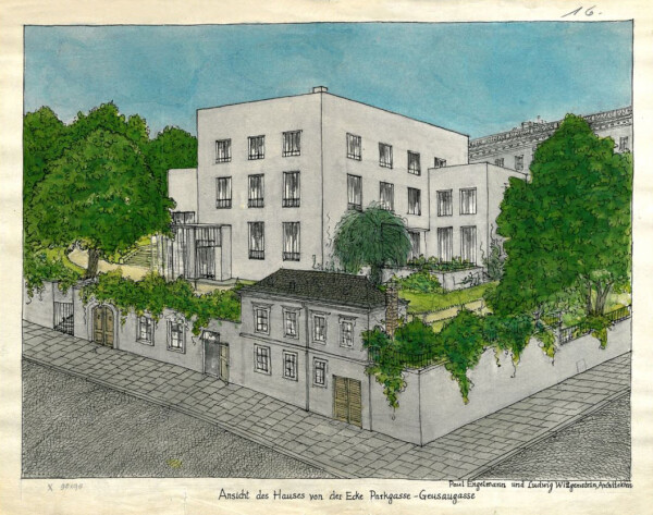 Paul Engelmann and Ludwig Wittgenstein: Design for the Villa Wittgenstein at Kundmanngasse 19, view from the corner of Parkgasse/Geusaugasse, 1926