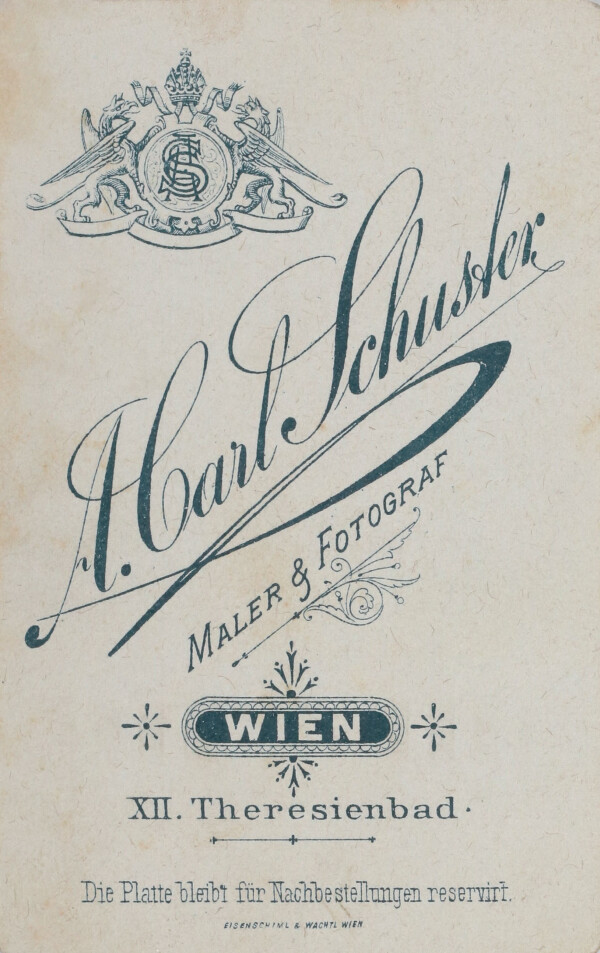 Anton Carl (also A. Carl or Karl) Schuster was born in Vienna on 1 August 1866 as son of the photographer Carl (or Karl) Schuster and in 1889/90 attended the Graphische Lehr- und Versuchsanstalt. He is known to have run a studio at No. 6 Meidlinger Hauptstraße near Theresienbadpark in Vienna’s 12th District starting in 1893. In addition to portraits, he also photographed Viennese street scenes and presented an impressive panorama of Laxenburg made up of several individual prints at the “1889 Jubilee Exhibition” at the Rotunda. The magazine Photographische Correspondenz reported on the event as follows: