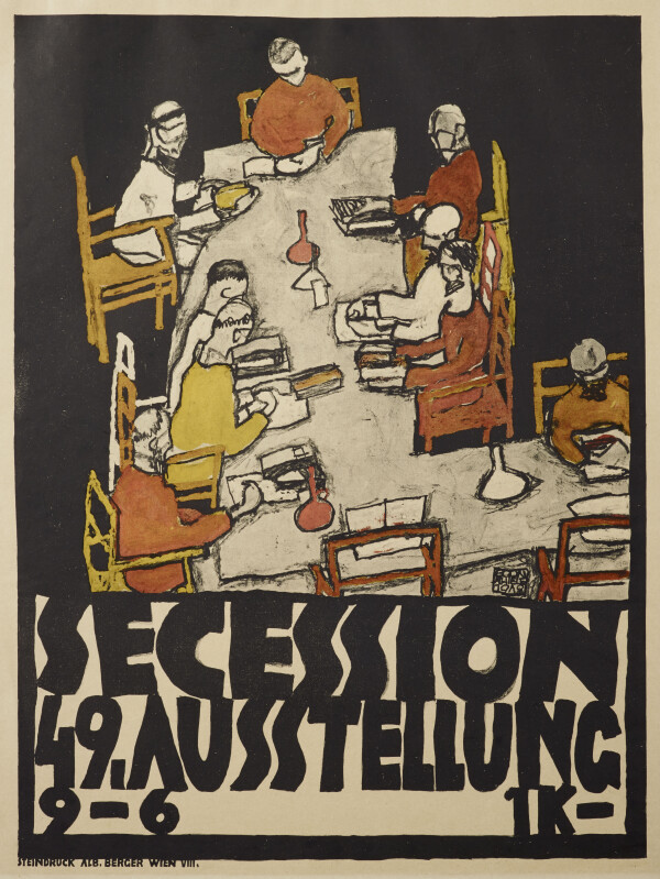 The poster for the exhibition was created by Schiele and represents a further development of the composition of his painting The Friends (Round Table) (1918, privately owned). It reflects Schiele’s rise as an artist among his companions in art. It is presumed that the vacant chair depicted opposite Schiele in the work is intended as a reference to Klimt’s death.