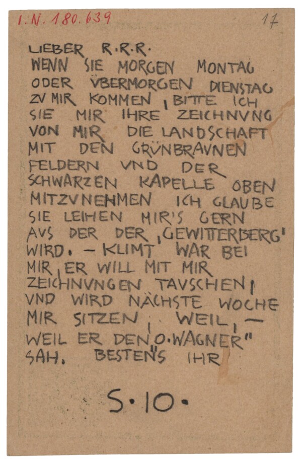 Egon Schiele: Correspondence Card from Egon Schiele in Vienna to Arthur Roessler in Vienna, 11/27/1910, Wienbibliothek im Rathaus