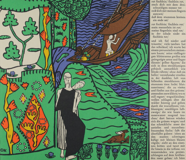 Carl Otto Czeschka and Bertold Löffler were among Kokoschka’s teachers. This afforded him a direct connection to the Wiener Werkstätte and to Gustav Klimt. Kokoschka would eventually be able to experiment with various design media for this innovative collective, primarily designing postcards, but also pictorial broadsheets and fans. His fairytale, visualized with moveable figures and transparent color drawings, Das getupfte Ei [The Speckled Egg] premiered in 1907 at the newly opened Kabarett Fledermaus, though this performance was not crowned with success.