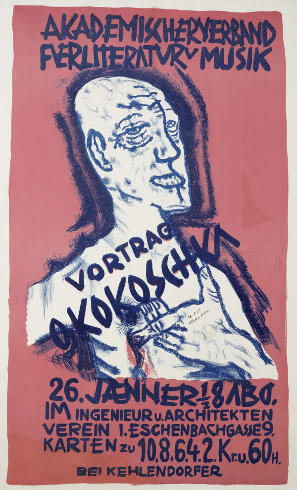 In 1909, Kokoschka featured with several works in the exhibition “Internationale Kunstschau.” Despite a lot of resistance, the presentation included the premiere of his play Mörder, Hoffnung der Frauen [Murderer, the Hope of Women], for which he also designed the poster. Kokoschka provoked audiences with his art once more. Loos became his mentor that year. He helped O. K. to “liberate himself from the School of Arts and Crafts” and to “rid himself of the Wiener Werkstätte.” During the following period, Kokoschka met Karl Kraus and his circle, as well as the gallery owners and future promoters Herwarth Walden and Paul Cassirer. Franz Hauer, an Egon Schiele supporter, and Dr. Oskar Reichel, who acted as patron to Schiele and Max Oppenheimer, were also among his advocates. Additionally, the Akademischer Verband für Literatur und Musik in Wien [Academic Association for Literature and Music in Vienna] provided him with an important network. He gave lectures as part of the association, such as Von der Natur der Geschichte [Of the Nature of History], for which he created a poster featuring a self-portrait.