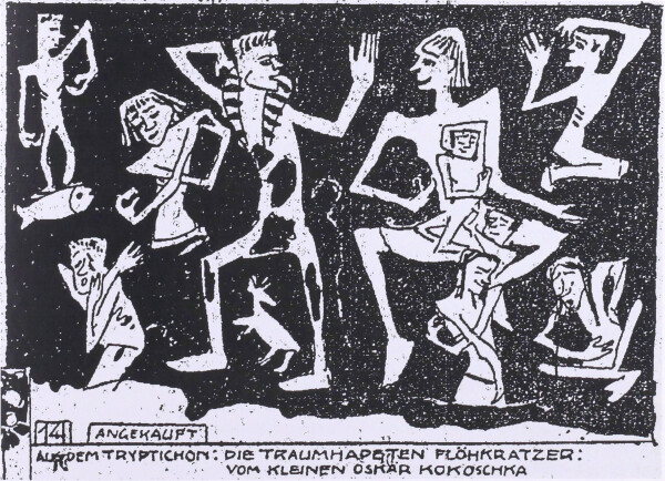 Kokoschka was invited by the Klimt Group to contribute a poster design for the exhibition “Kunstschau Wien” in 1908, and was given the chance to exhibit several works. Among these works, most of which were shown in room 14, were drawings, Die träumenden Knaben and the scandalous large-scale triptych Die Traumtragenden [The Dream Carriers] (date and whereabouts unknown). While this draft, intended for a Gobelin tapestry, is considered lost, we have a basic idea of what it looked like owing to a detailed caricature by Theo Zasche and a few contemporary descriptions. The distorted rendering of the figures caused a scandal, with the artist encountering increasing criticism even within the Klimt Group. According to the recollections of Berta Zuckerkandl, however, Klimt staunchly defended Kokoschka against these critics:
