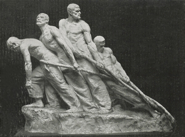 Ries was able to build on her first successful exhibition at the Secession in the following year. At the “VII. Ausstellung der Vereinigung bildender Künstler Österreichs Secession” [“7th Exhibition of the Association of Austrian Artists Secession”], her monumental sculpture Invincibles (1900, Kongresspark, Vienna-Ottakring, 16th District) was presented. Since the sculpture could not be completed in time for the opening, it was added later on. Invincibles replaced Gustav Klimt’s Faculty Painting Philosophy (1900–1907, destroyed by fire at Immendorf Castle in 1945), which had to be taken down prematurely to be transported to the Paris World’s Fair (1900). Klimt’s work had caused an enormous scandal and was therefore one of the most significant and most frequently reviewed exhibits. The fact that Ries’s sculpture was deemed suitable to replace this central painting in the exhibition shows the Secession’s great appreciation for the artist’s work. Viennese audiences were also very interested in the sculpture. The work was discussed in great detail in exhibition reviews and was even the sole subject of several articles.
