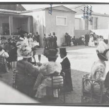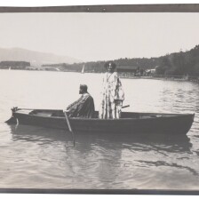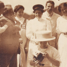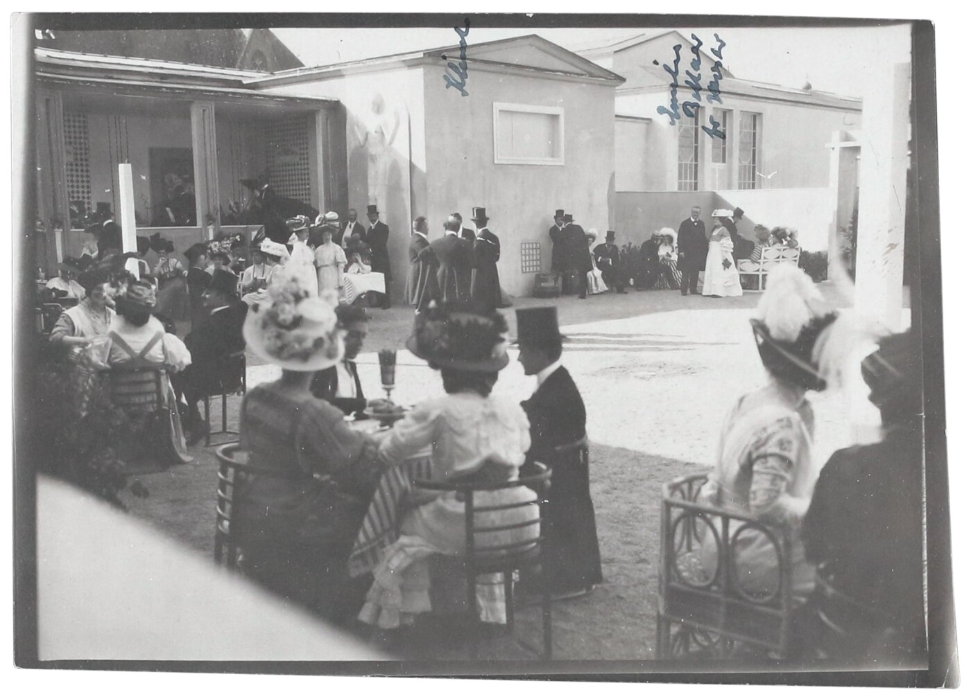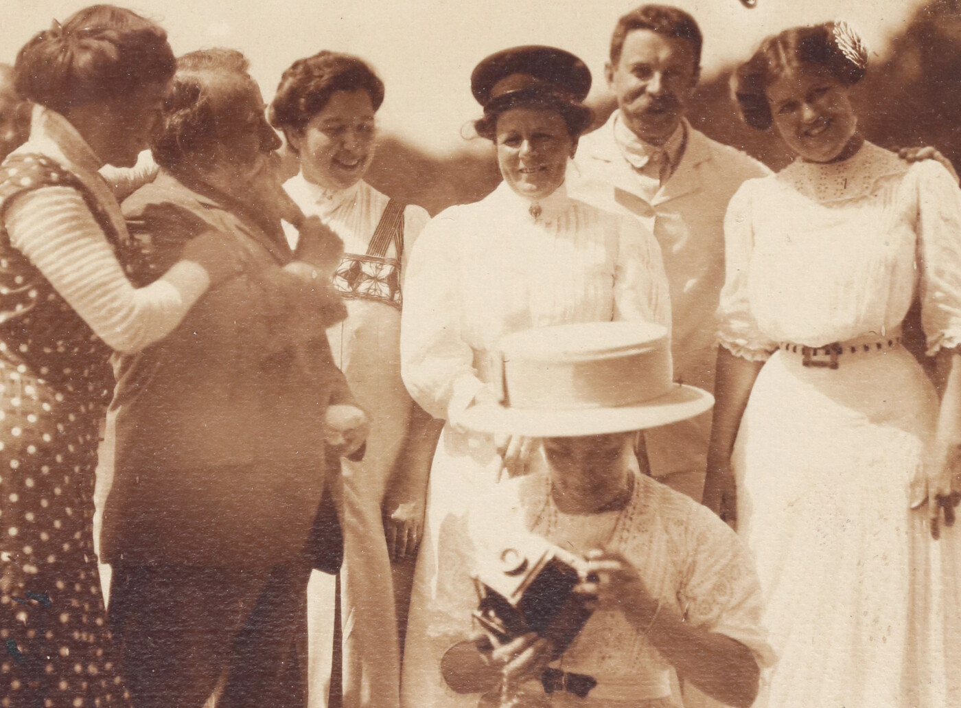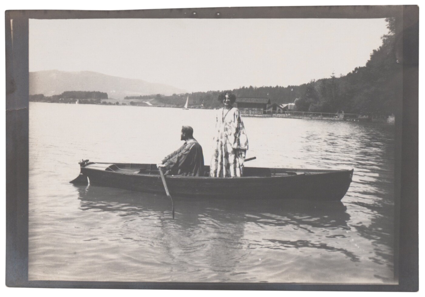 Emma Bacher herself took a keen interest in amateur photography. In 1908, she documented the opening of the “Kunstschau Wien” with her photographs. Equipped with a small camera, she captured the visitors – among them family members – on the exhibition grounds in a series of snapshots. We further owe several private photographs taken during the summer sojourns on the Attersee to her. Boasting the “snapshot format,” a format typical for amateur photographers measuring approx. 12 x 9 cm, the pictures show Klimt and Emilie Flöge with friends and family members during boat rides and in the environs of Villa Paulick.