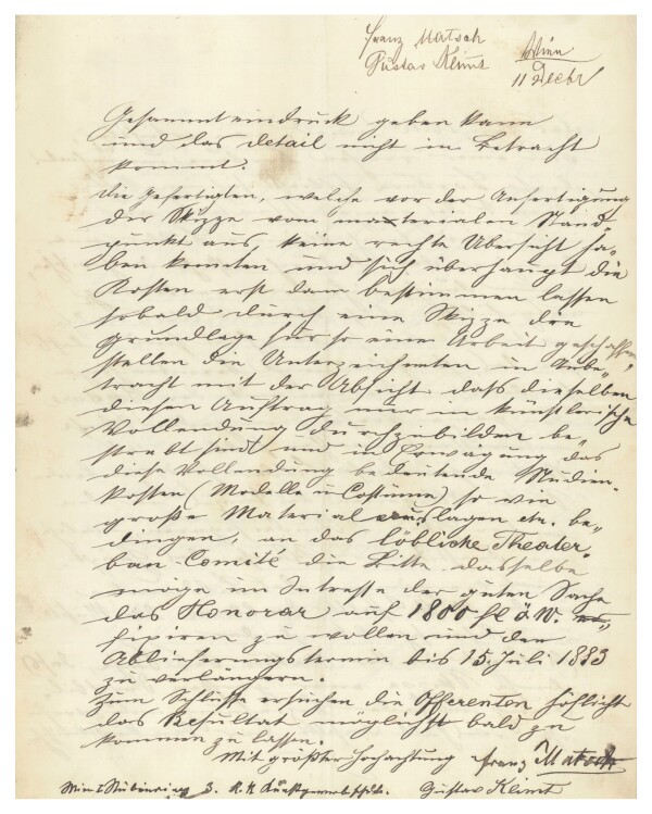 - Brief von Franz Matsch in Wien an das Theaterbaucomité in Reichenberg, mitunterschrieben von Gustav Klimt (09.12.1882). VI. – Gd, 202, Signatur 709/4, Karton 188_2, .