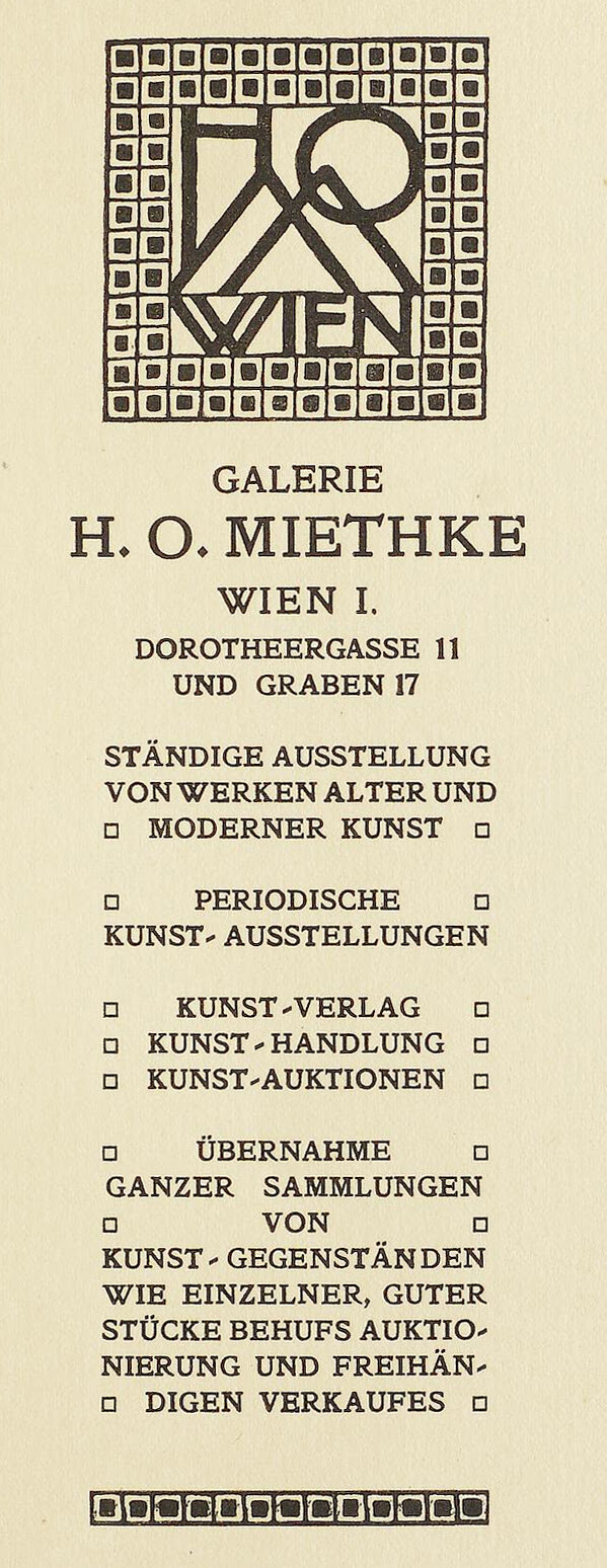 Business advertisement, in: Galerie H. O. Miethke (Hg.): Öffentliche Versteigerung des künstlerischen Nachlasses von Rudolf von Alt in der Galerie H. O. Miethke, Wien, I. Graben 17, Aukt.-Kat., Vienna 1906.